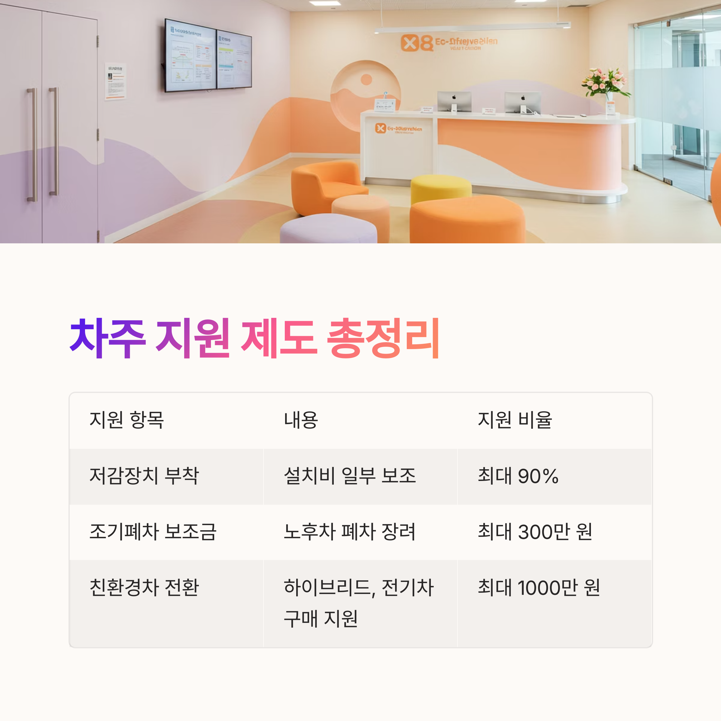 | 친환경차 전환 보조 | 하이브리드, 전기차 구매 지원 | 최대 1000만 원 |