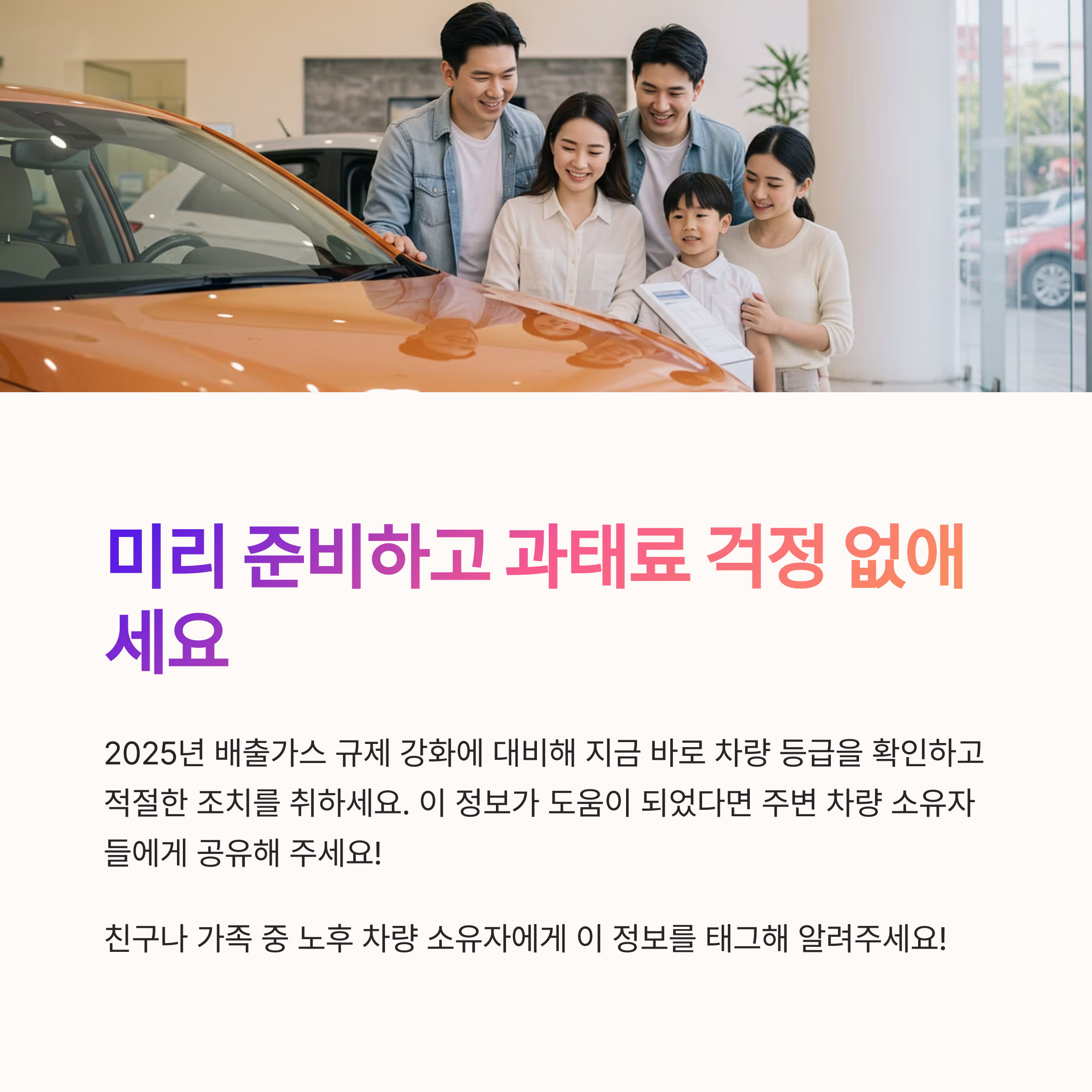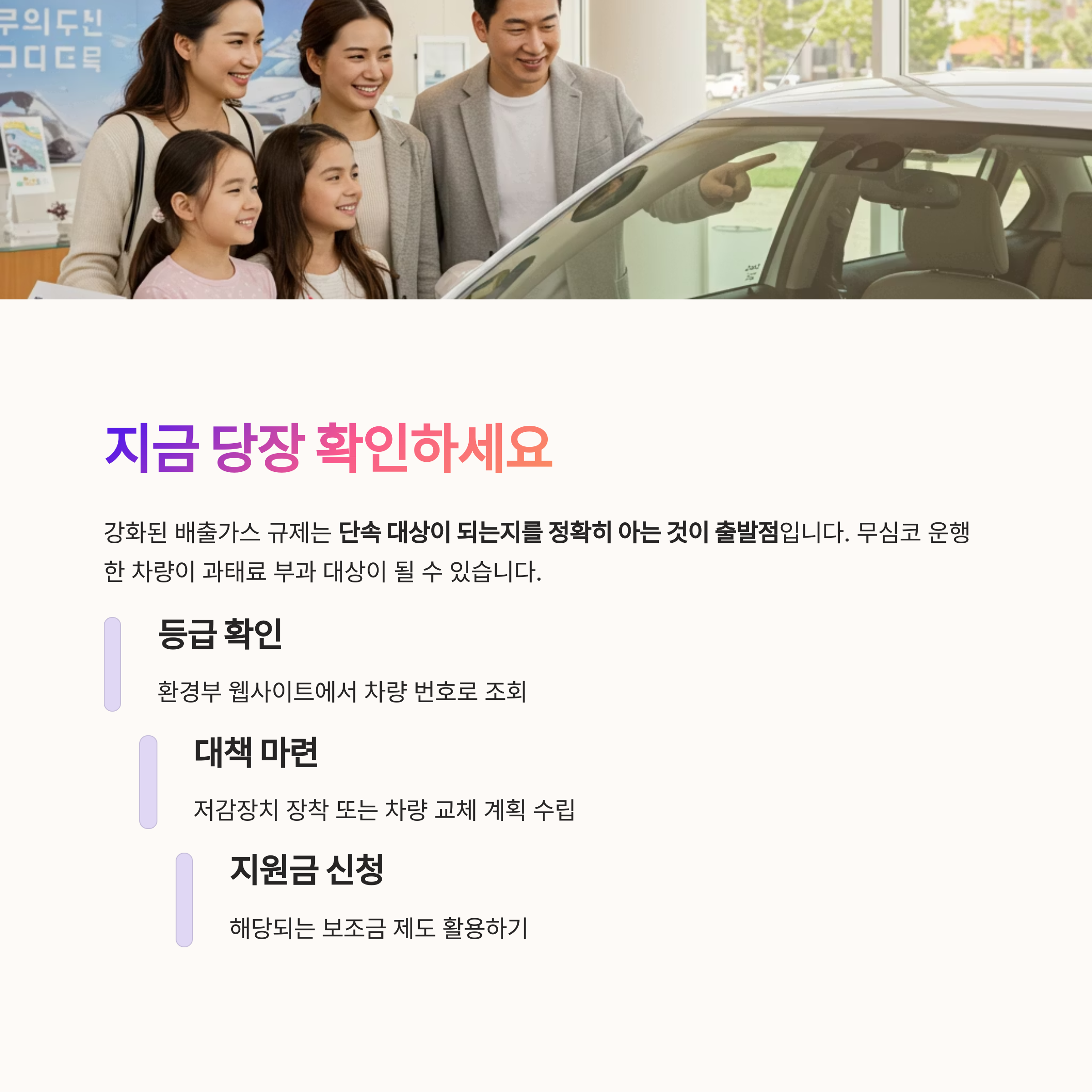 강화된 배출가스 규제는 단속 대상이 되는지를 정확히 아는 것이 출발점입니다. 무심코 운행한 차량이 과태료 부과 대상으로 전환되는 상황을 피하려면, 지금 바로 차량 등급을 확인하고 적절한 조치를 취해야 합니다.