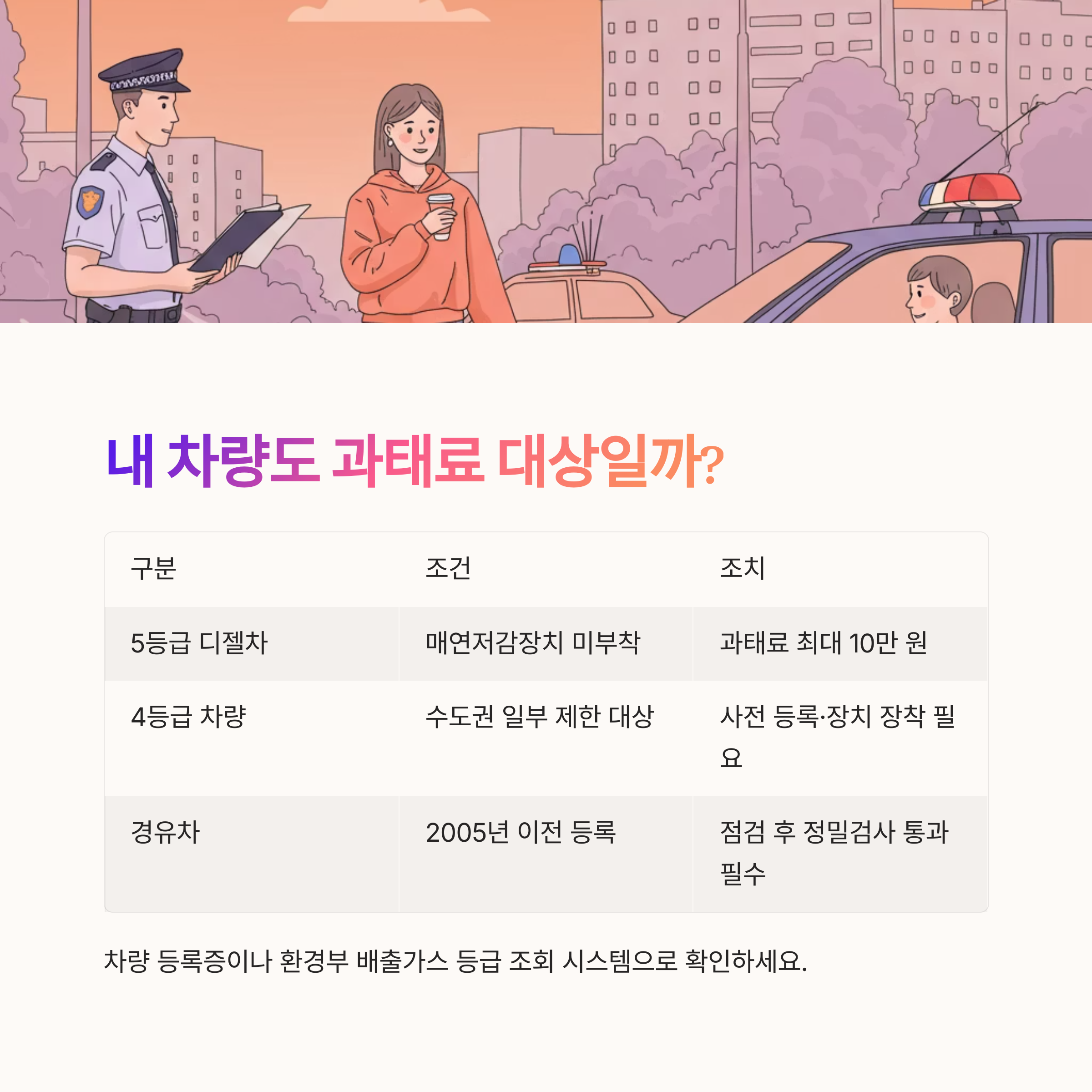 | 5등급 디젤차 | 매연저감장치 미부착 | 과태료 최대 10만 원 |