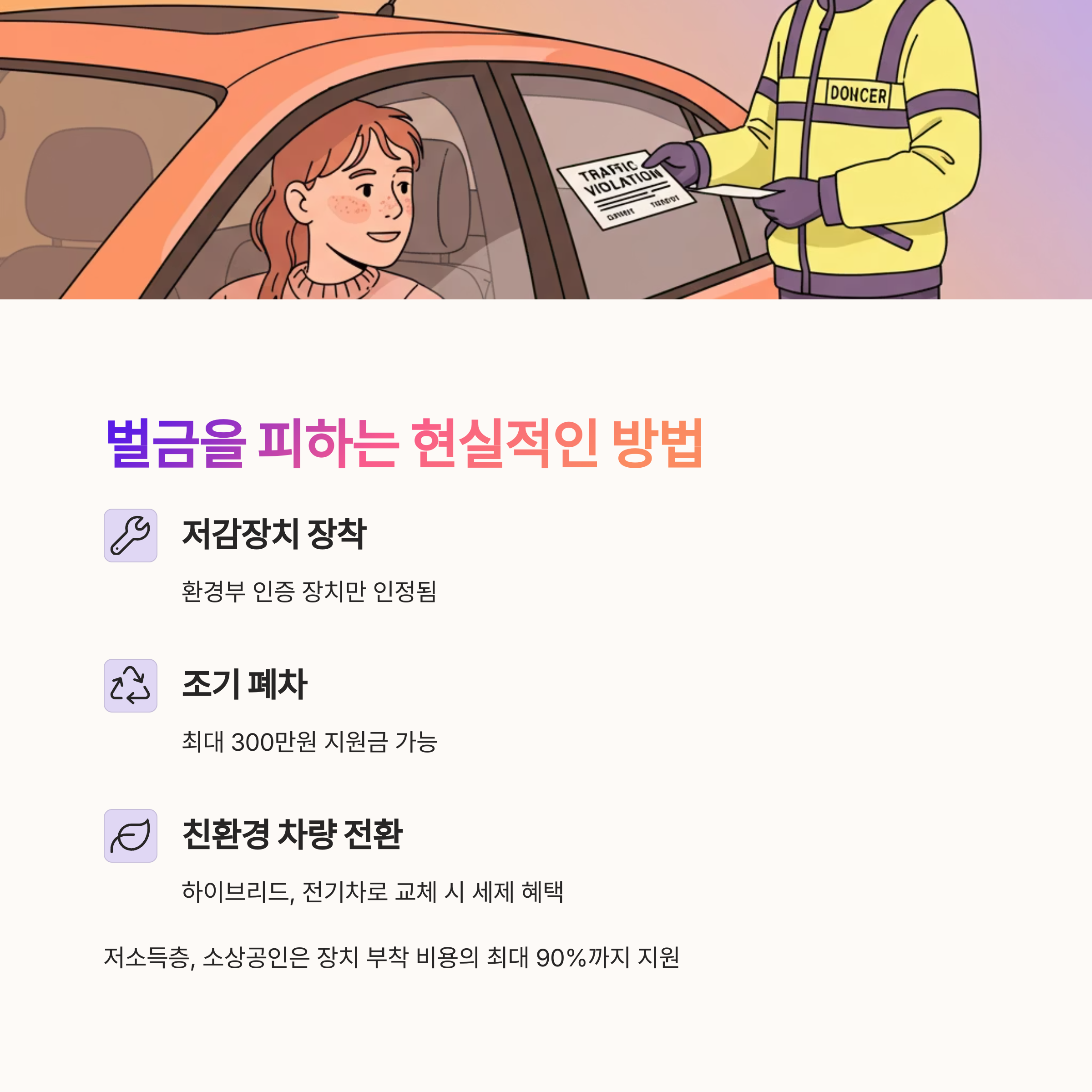 규제 회피를 위해서는 환경부 인증 저감장치 장착 또는 조기 폐차가 필요합니다. 저소득층이나 소상공인을 대상으로는 장치 부착 비용의 최대 90%까지 지원되는 보조금 제도도 운영되고 있습니다.