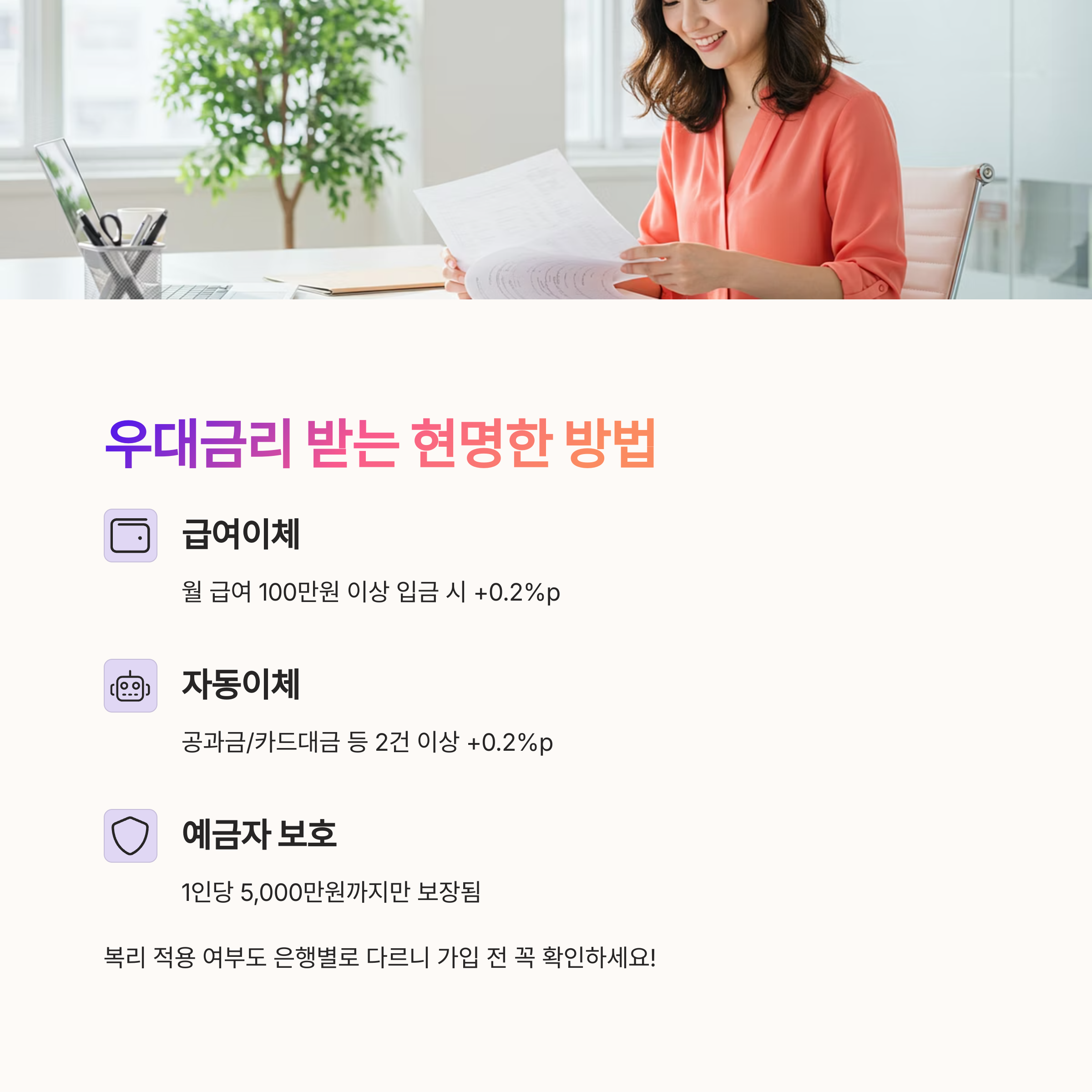 | 우대금리 조건 | 자동이체·급여이체 시 우대금리 0.2~0.5% 적용 가능 |