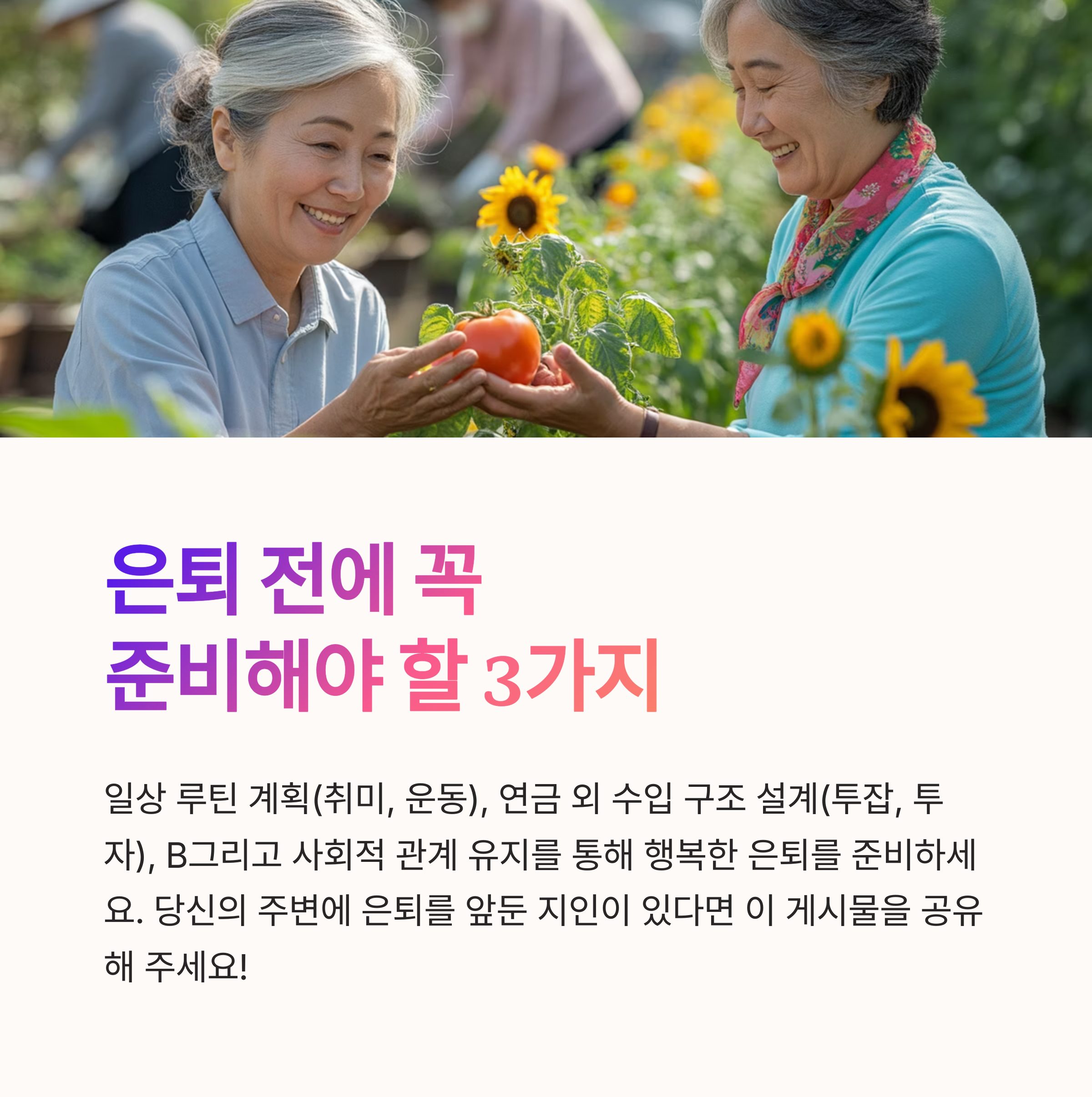 | 사전 계획의 중요성 체감 | 소득 대체 수단 반드시 필요 | 커뮤니티·모임 등 참여 중요 |