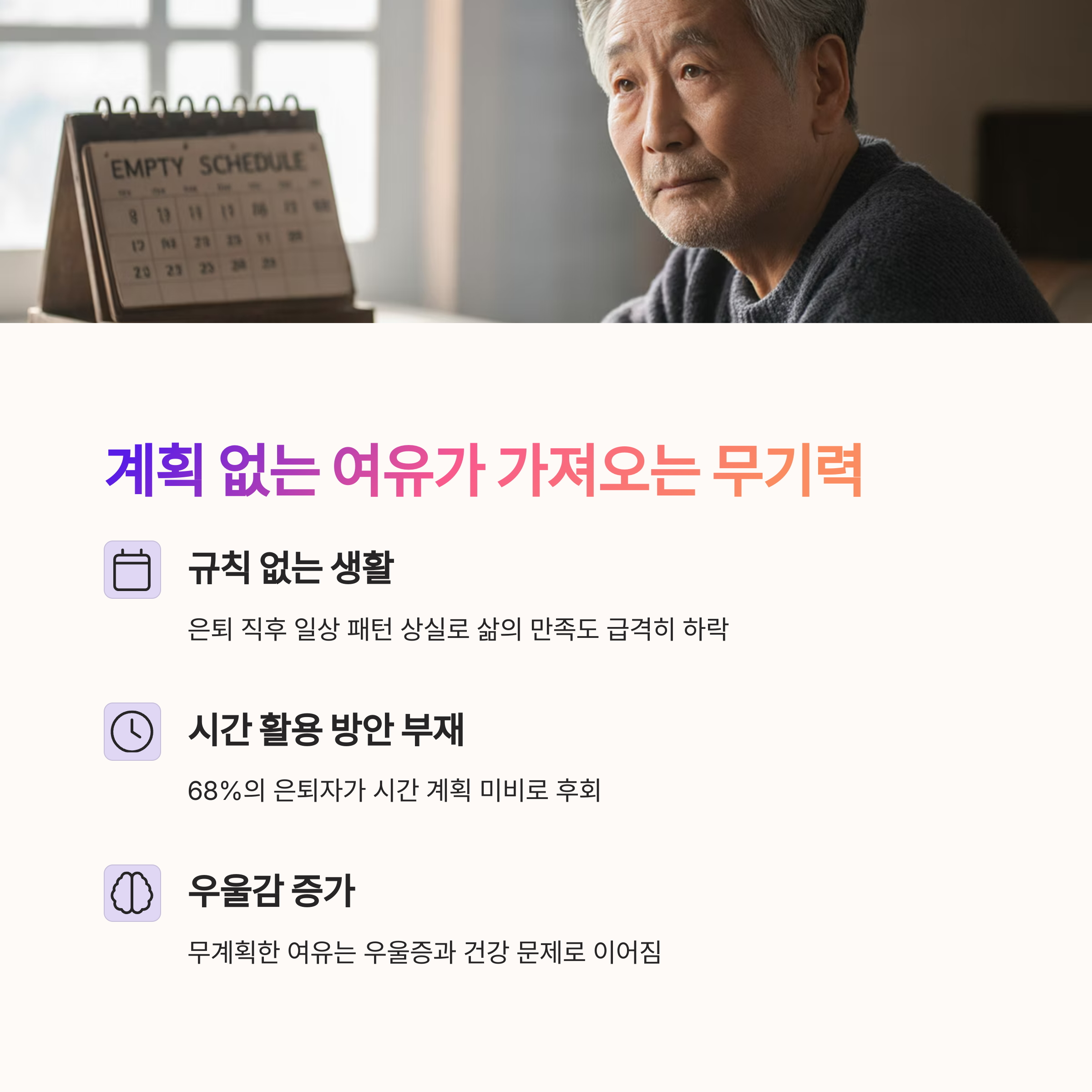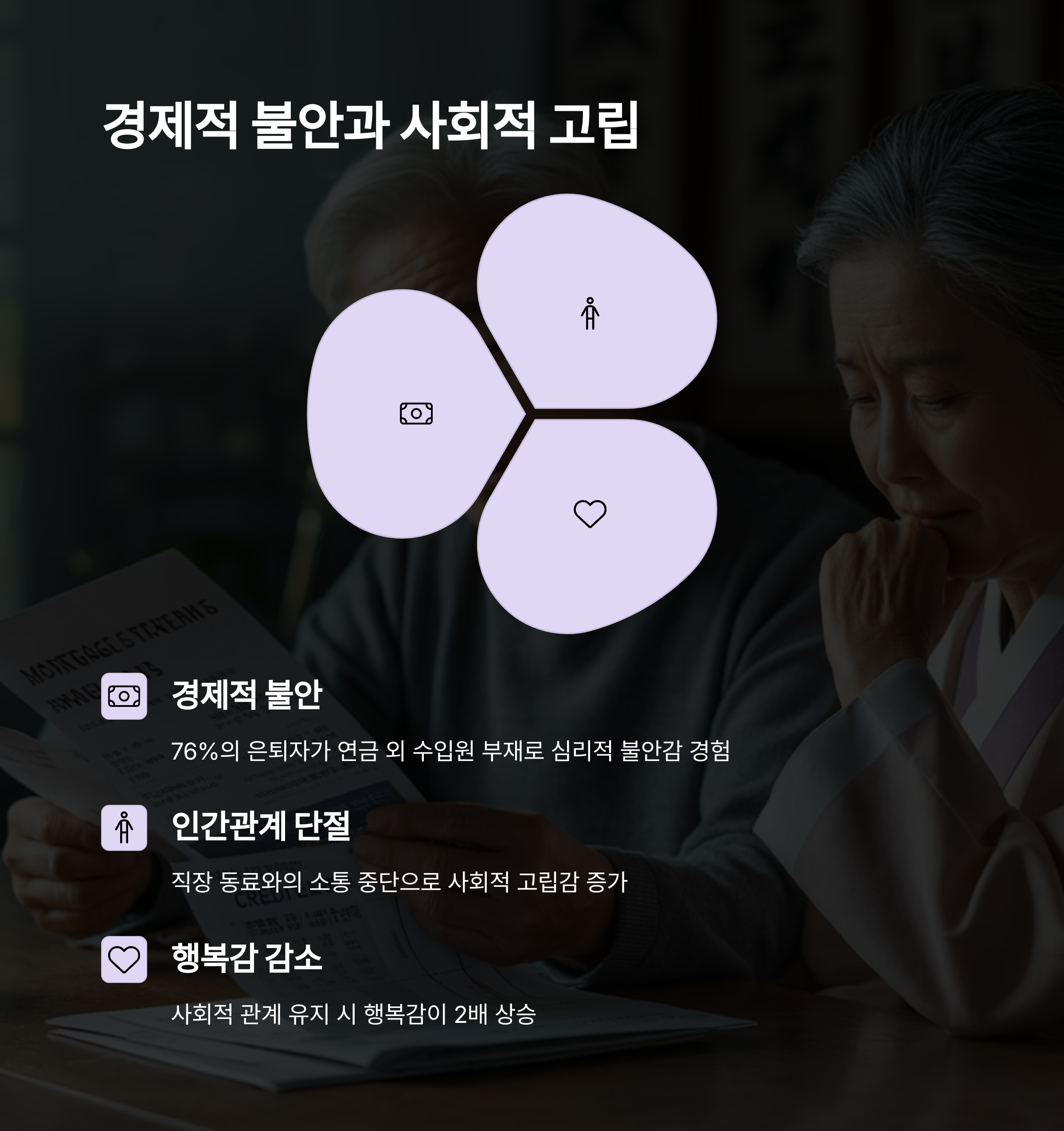 | 은퇴 준비 미흡 | 경제 계획 부족 | 인간관계 단절 |
