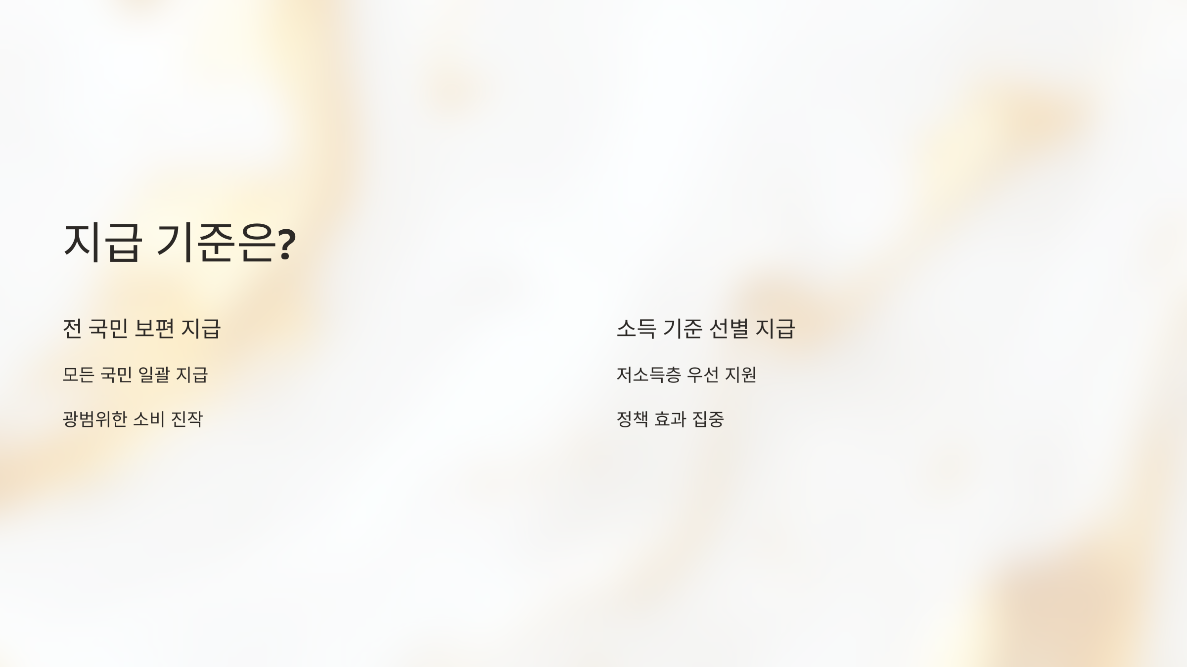 | 예상 지급 대상 | 전 국민 (보편 지급 가능성) | 소득 하위 계층 또는 취약 계층 (선별 지급 가능성) | 정책 목표와 재정 상황의 균형 |
