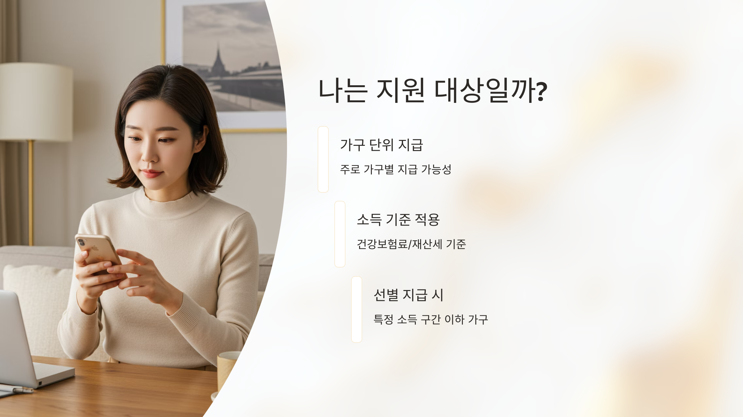 - 3. 특정 취약 계층 지급 시: 기초생활수급자, 차상위계층 등 별도 기준 적용.