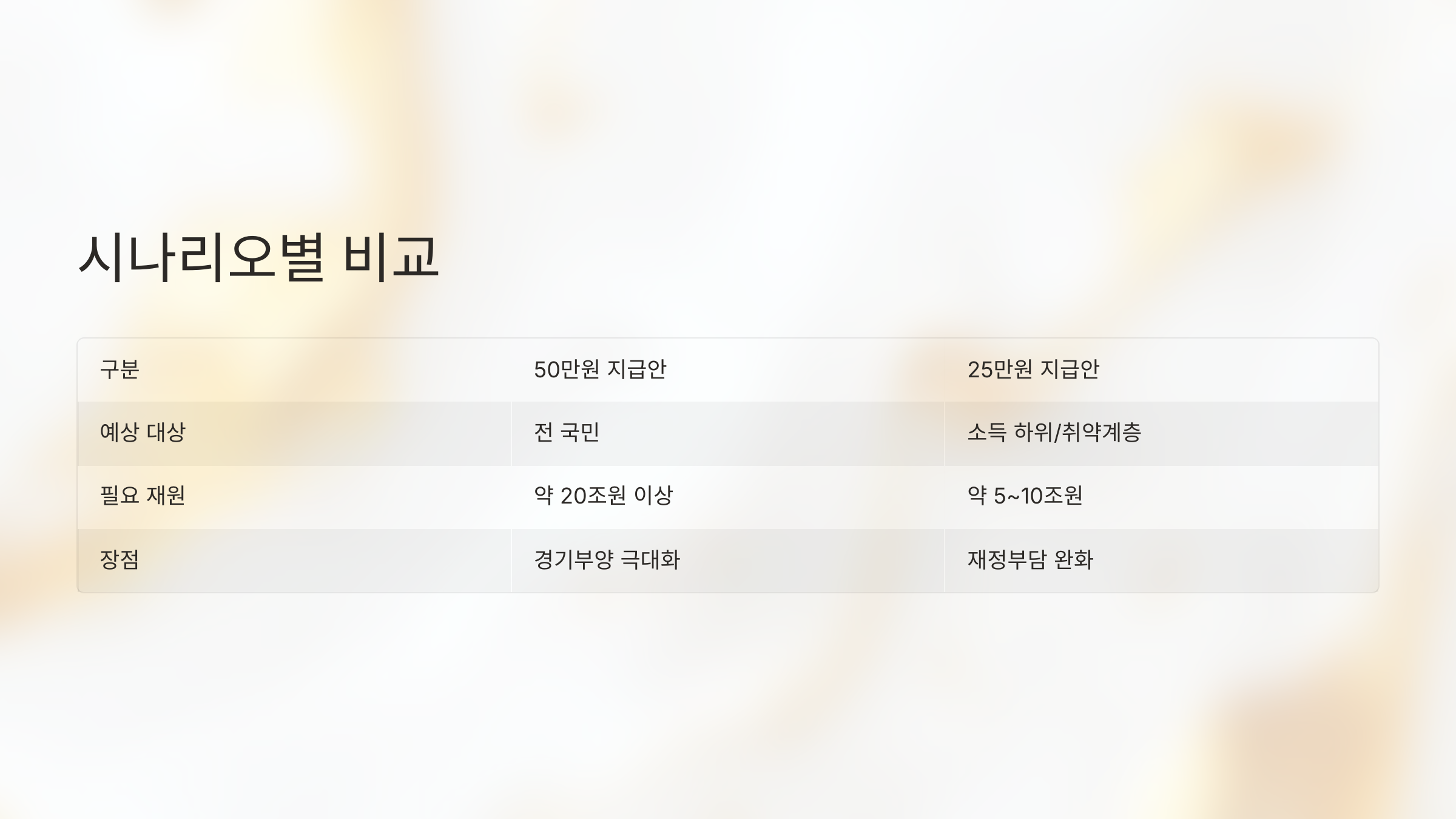 | 필요 재원 (추정) | 약 20조원 이상 (전 국민 지급 시) | 약 5~10조원 (선별 지급 시) | 국가 재정 건전성 |
