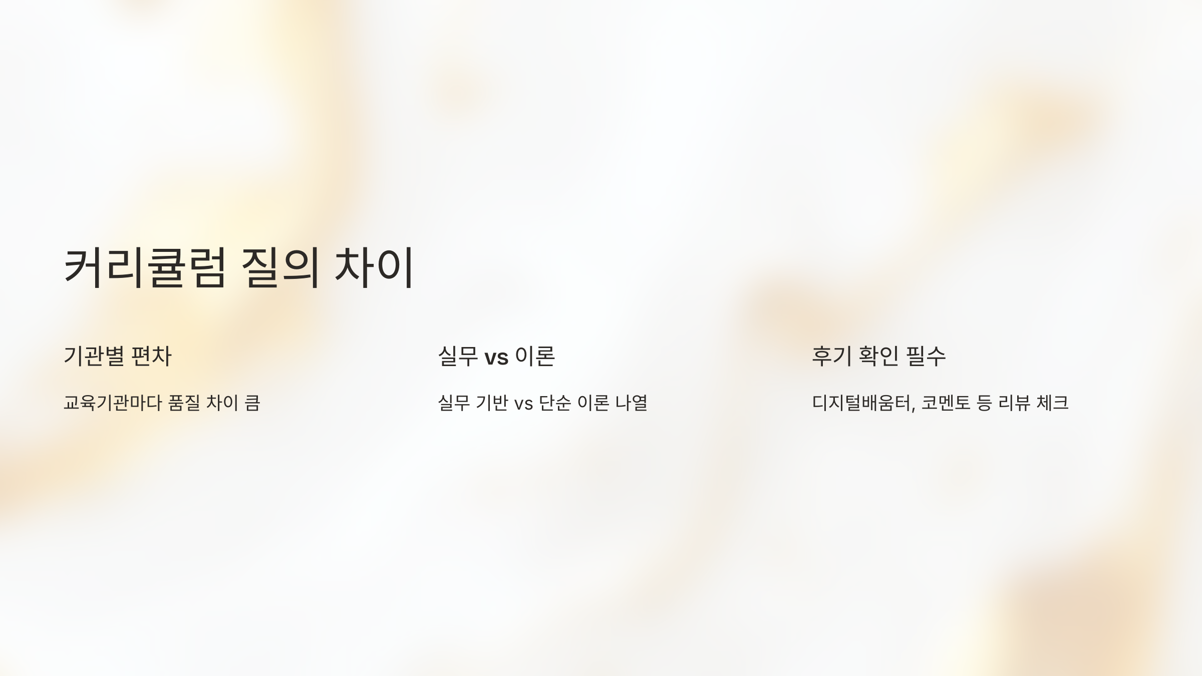 교육기관마다 편차가 매우 크다는 점은 많은 수강생이 지적한 부분입니다.