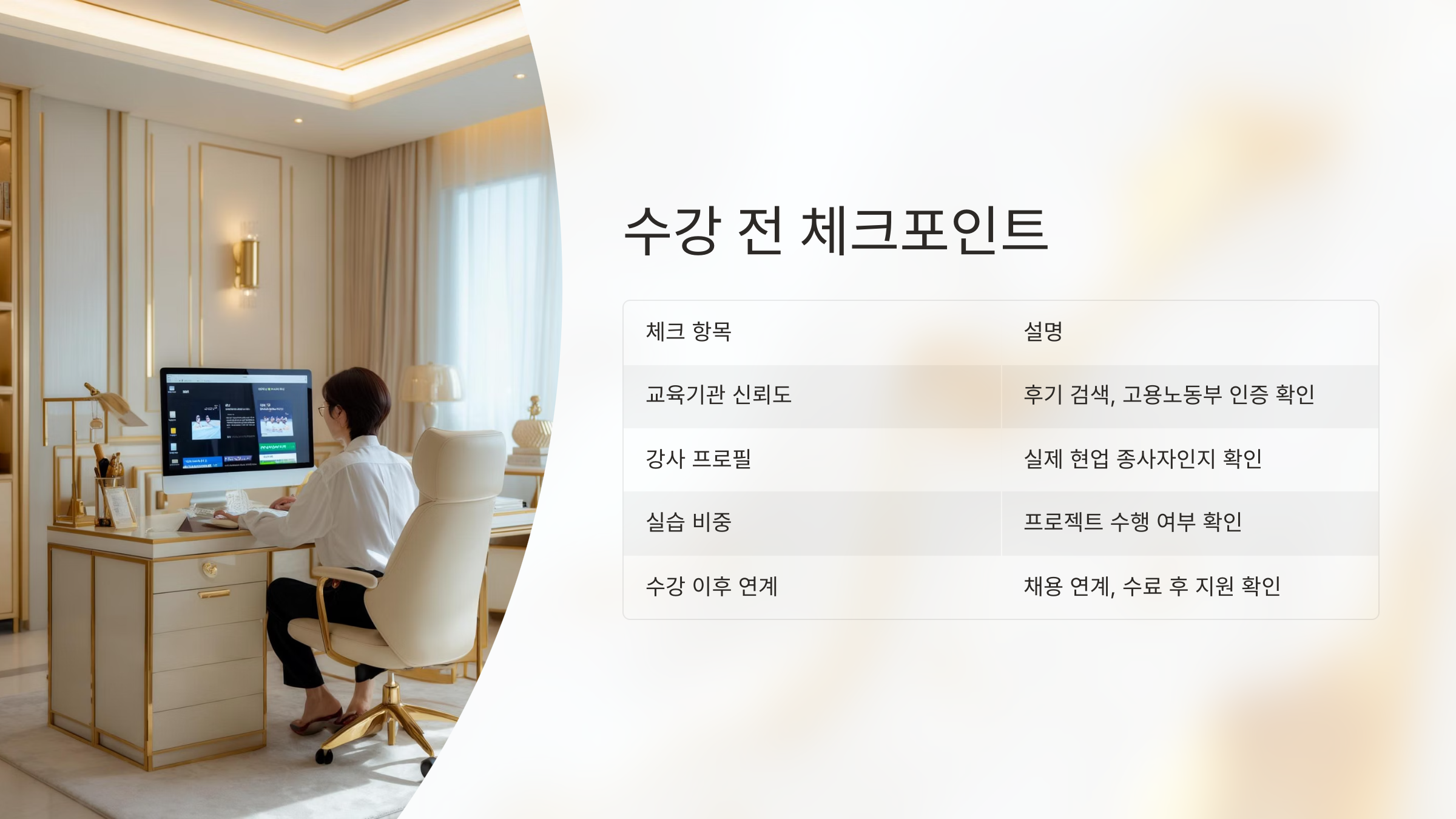 | 교육기관 신뢰도 | 후기 검색, 고용노동부 인증 확인 |