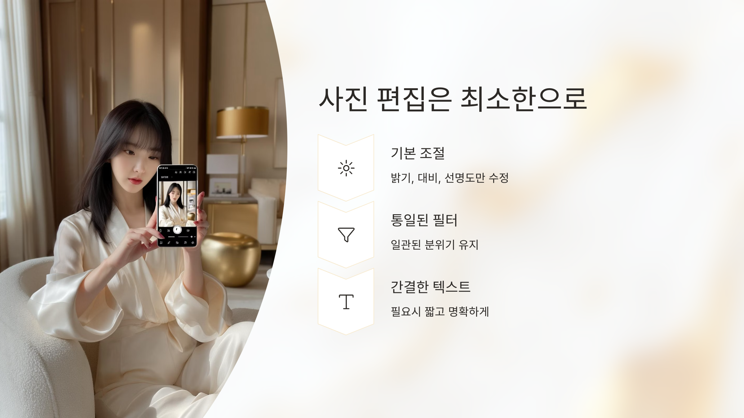 너무 많은 보정은 오히려 자연스러움을 해치고 SNS 반응이 떨어질 수 있습니다.