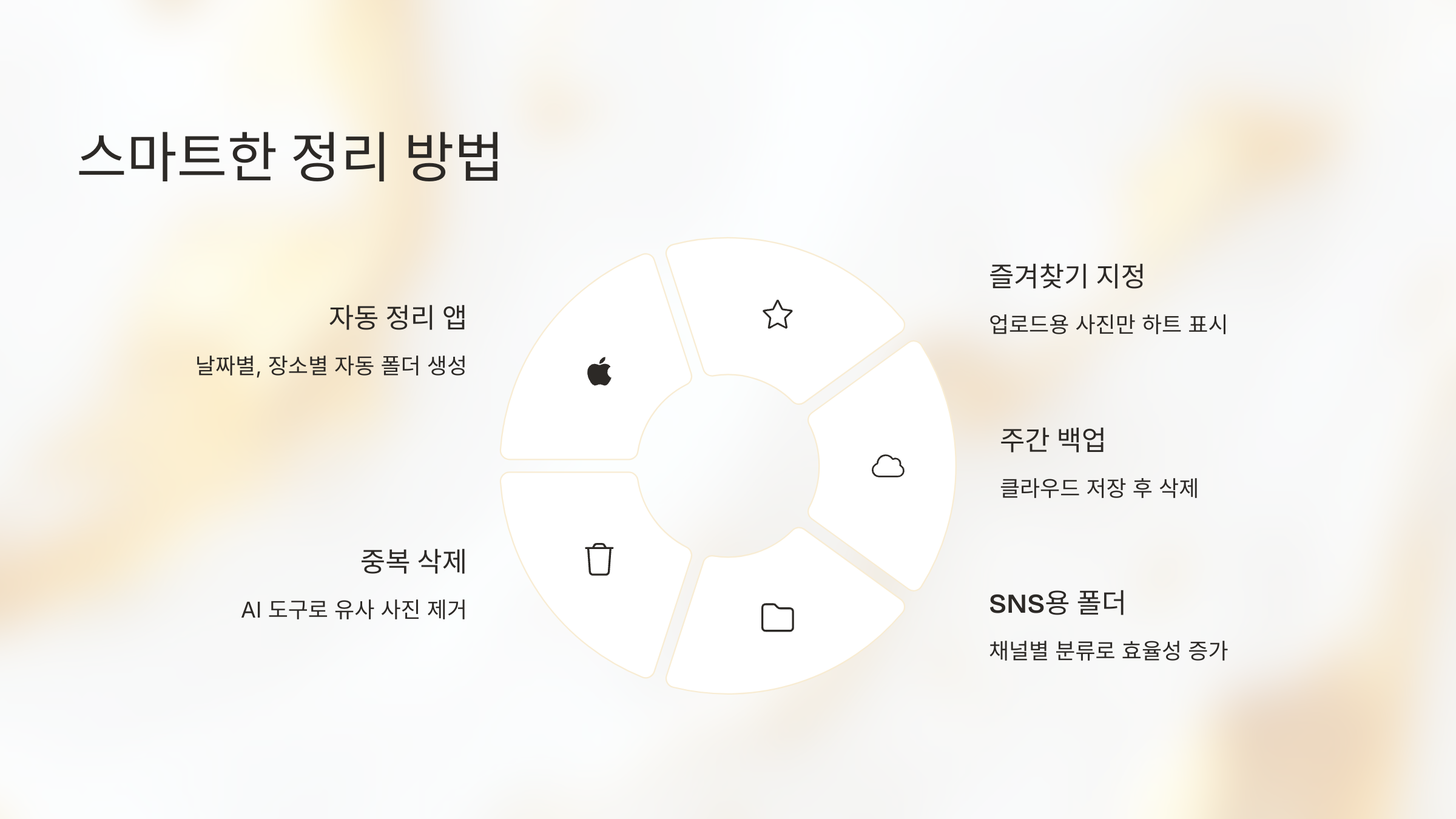 - 날짜, 장소, 인물, 음식 등 자신만의 기준을 설정해 폴더 생성