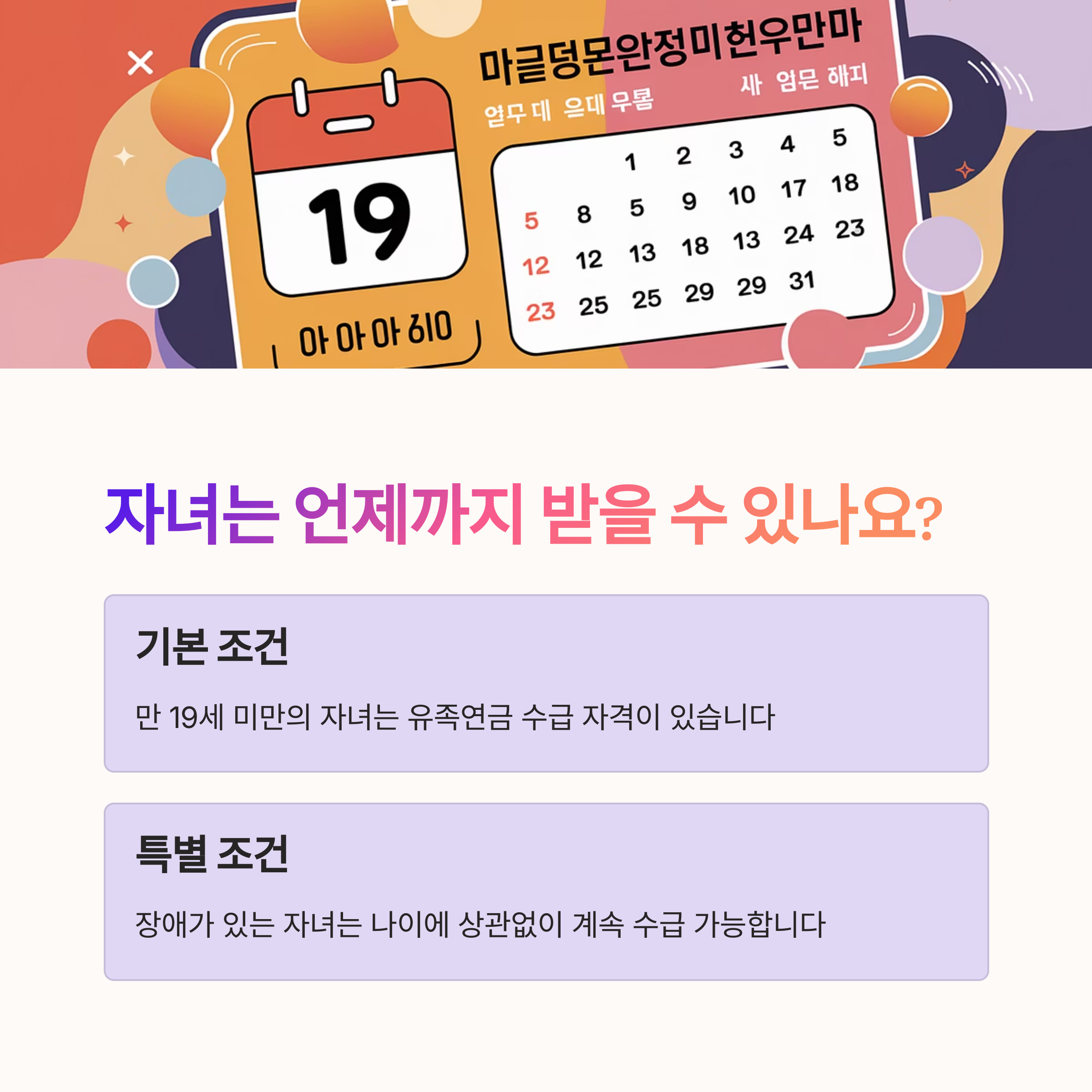| 배우자가 사망하거나 재혼하면 수급권이 종료됩니다. | 대학 재학 중이라면 만 22세까지도 연장 가능성이 있습니다. | 수급 순위 변경 시 빠른 신고가 필요합니다. |