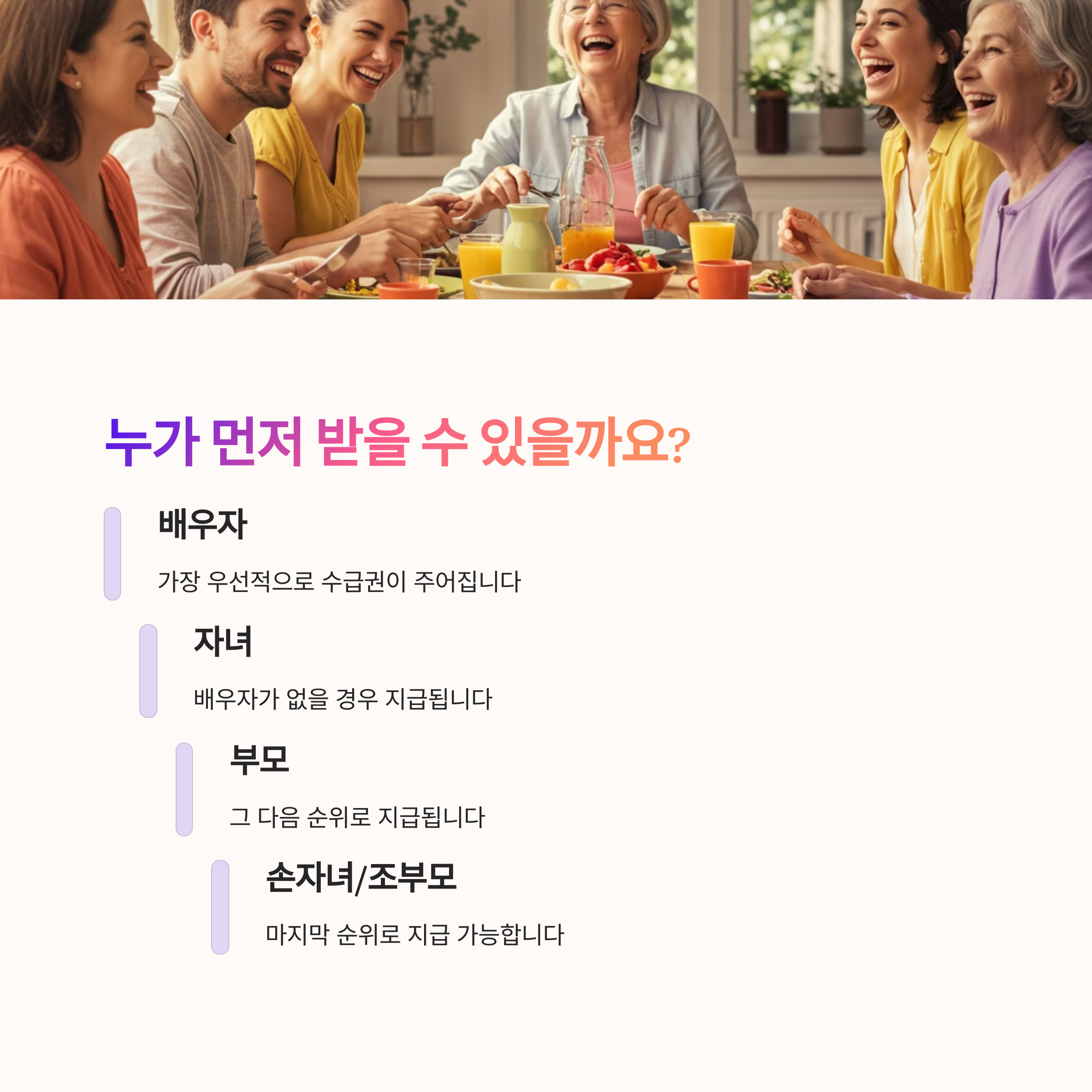 | 수급자 우선순위 | 배우자가 최우선이며, 없을 경우 자녀에게 지급됩니다. |