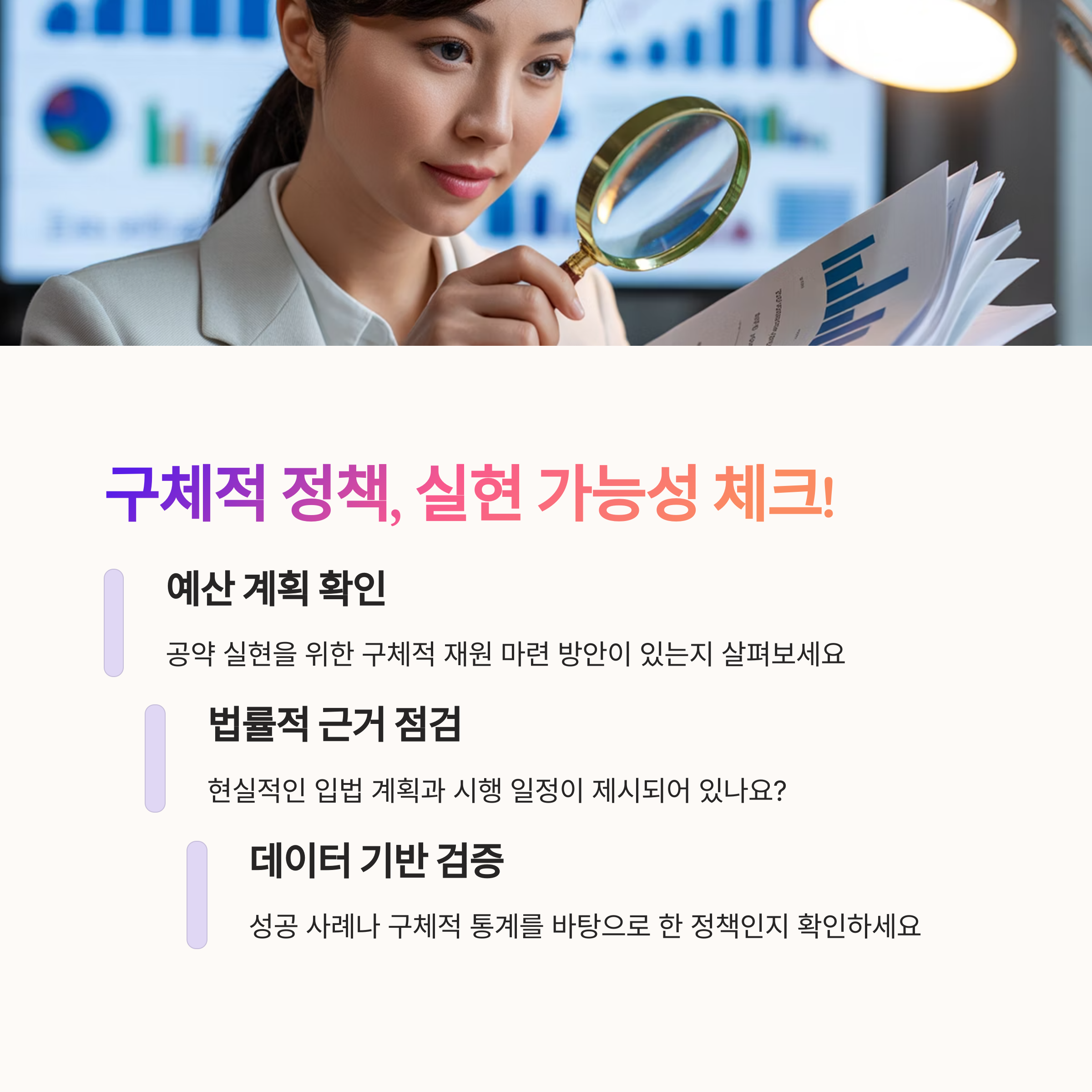| 분야별로 다른 후보의 우선순위 살펴보기 | 수치 기반 정책인지 여부 확인 필요 | 자신의 가치와 맞는 후보 선택하기 |
