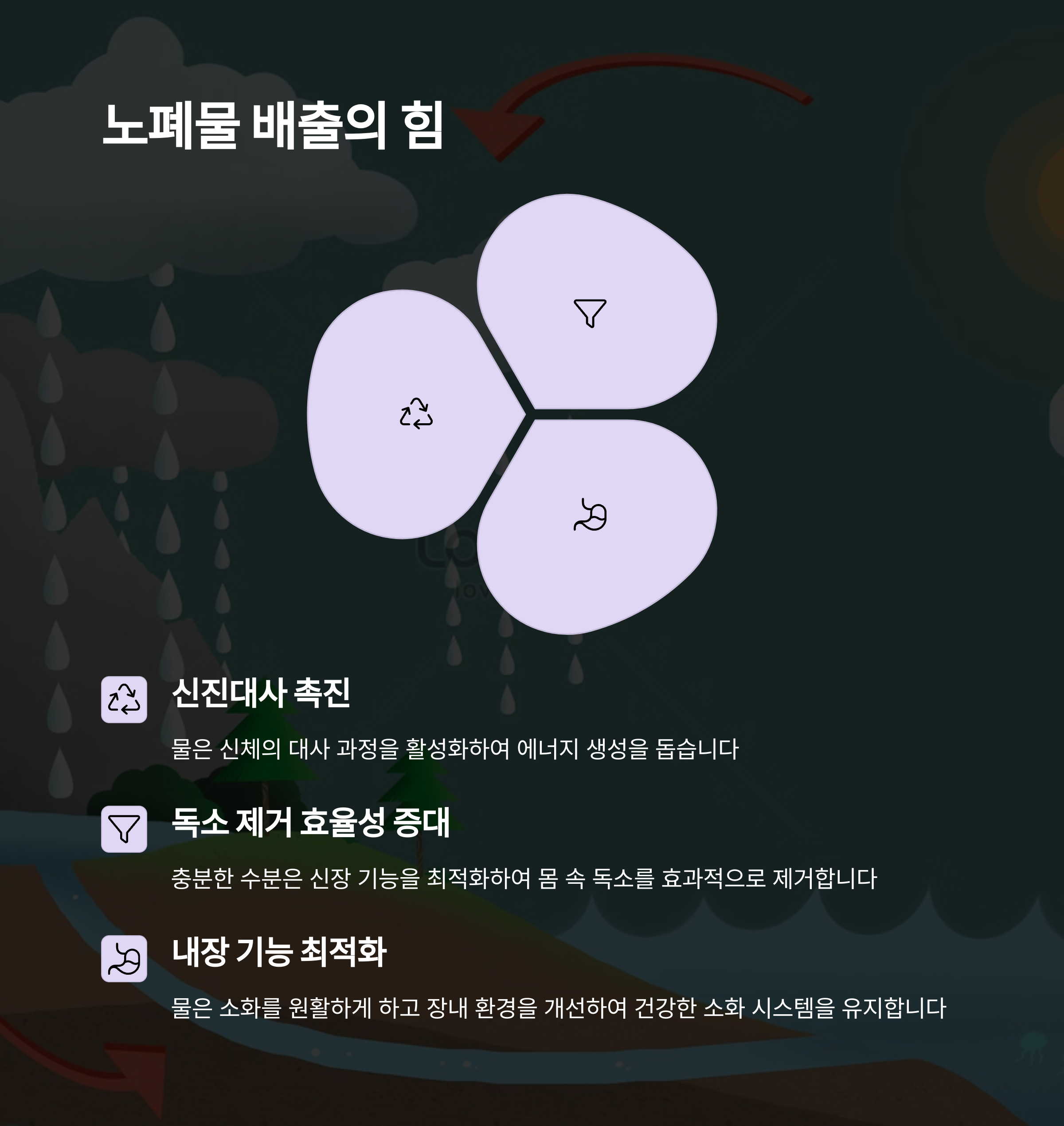 | 물 부족 증상 | 두통, 피로감, 집중력 저하 등이 발생할 수 있어요. |