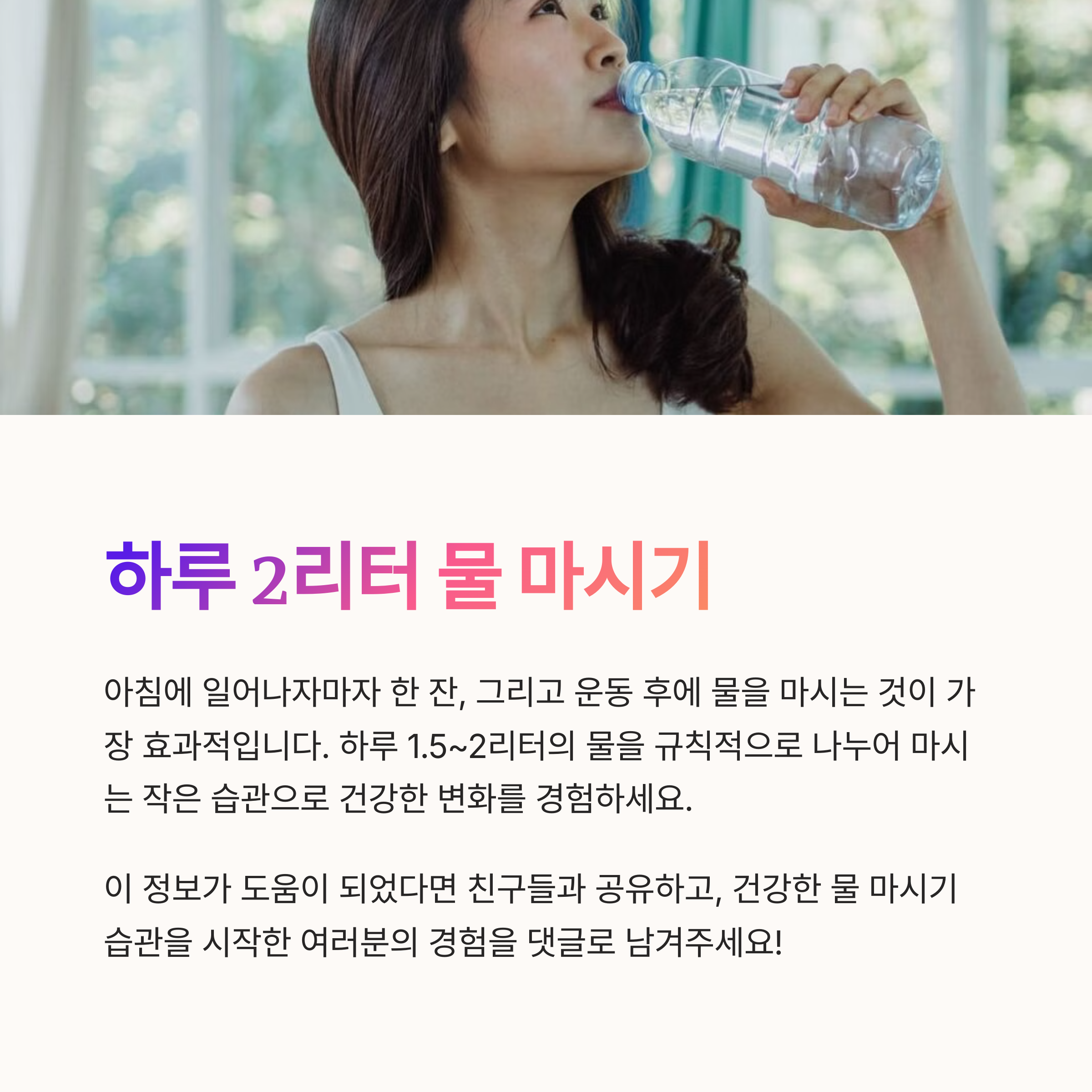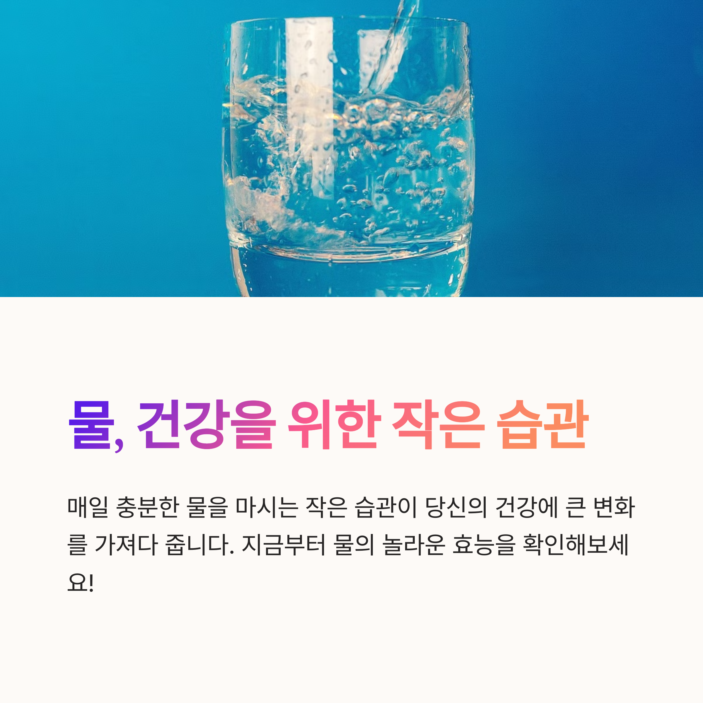 | 수분 부족으로 인한 트러블도 예방할 수 있어요. | 충분한 물 섭취로 피로감도 줄어듭니다. | 학생 및 직장인에게 꼭 필요한 습관입니다. |