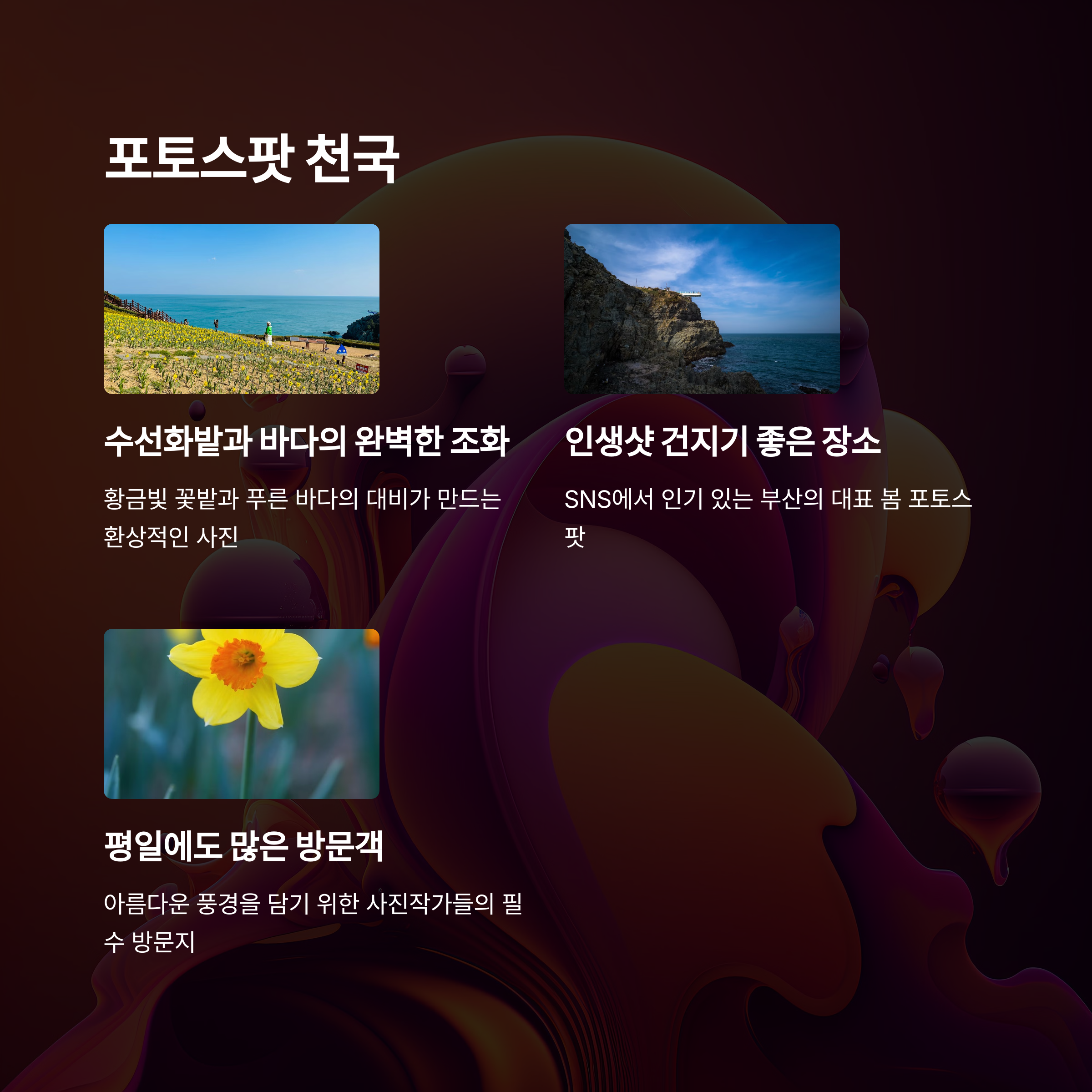 | 사진 명소, 가족 나들이 장소로도 적합 | 수선화 외에도 다양한 봄꽃이 즐비 | SNS 감성 여행지로 각광받는 추천 스팟 |