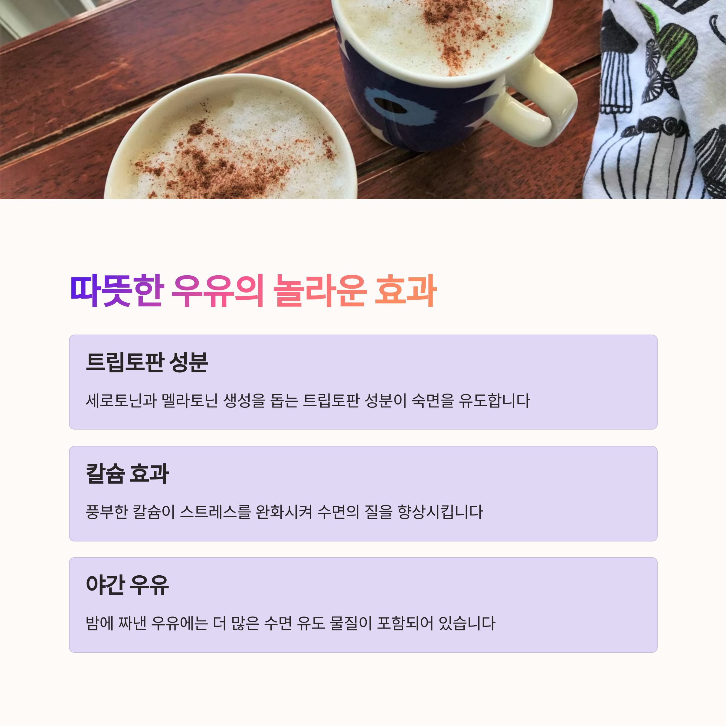 불면증은 단순한 수면 부족이 아니라 우리의 건강 전반에 영향을 미치는 중요한 신호입니다. 음식으로 조절하는 방법은 간편하면서도 부작용이 적고, 꾸준한 실천만 있다면 누구나 숙면을 경험할 수 있습니다. 이 글을 통해 나에게 맞는 수면 음식 한두 가지를 오늘 저녁 식사부터 실천해보세요. 사소한 변화가 일상에 큰 안정을 가져올 수 있습니다.