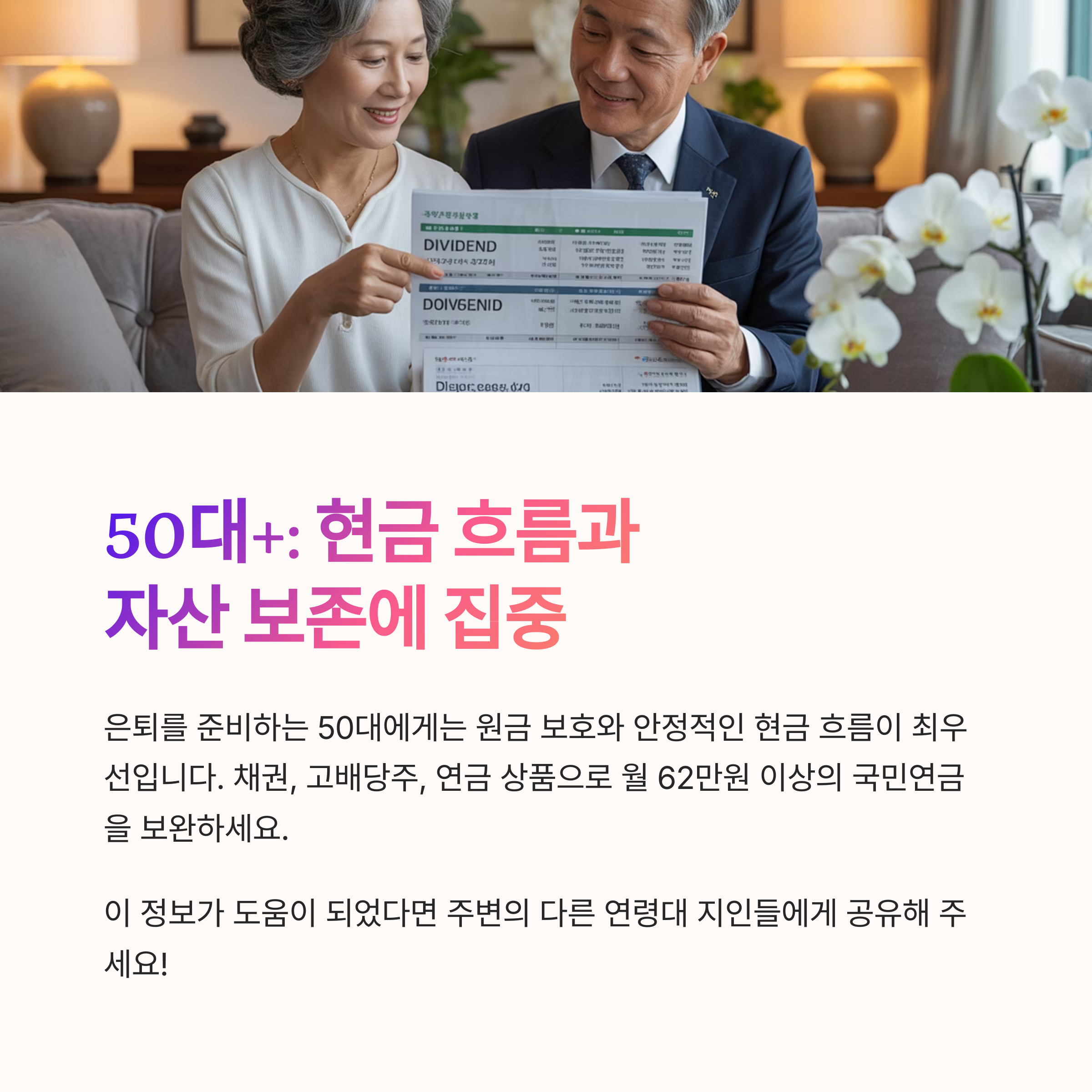 | 50대 이후 | 채권·배당주 중심 안정 추구 전략 필요 |