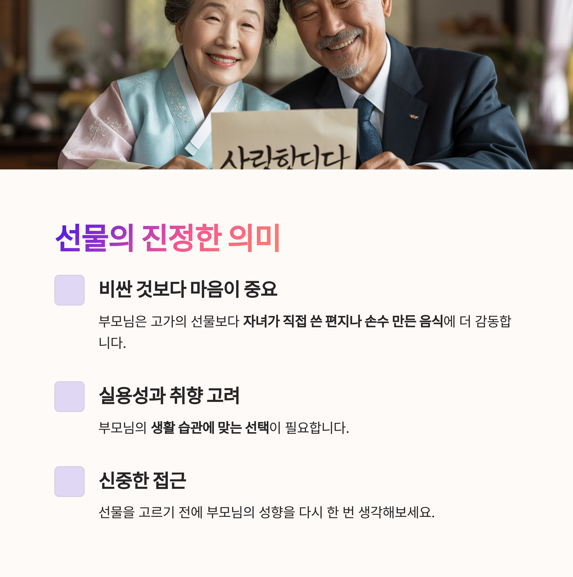| 매해 반복되지만 매번 새로워야 해요 | 부모님이 원하지 않을 수 있어요 | 진심이 담긴 표현이 가장 큰 선물이에요 |