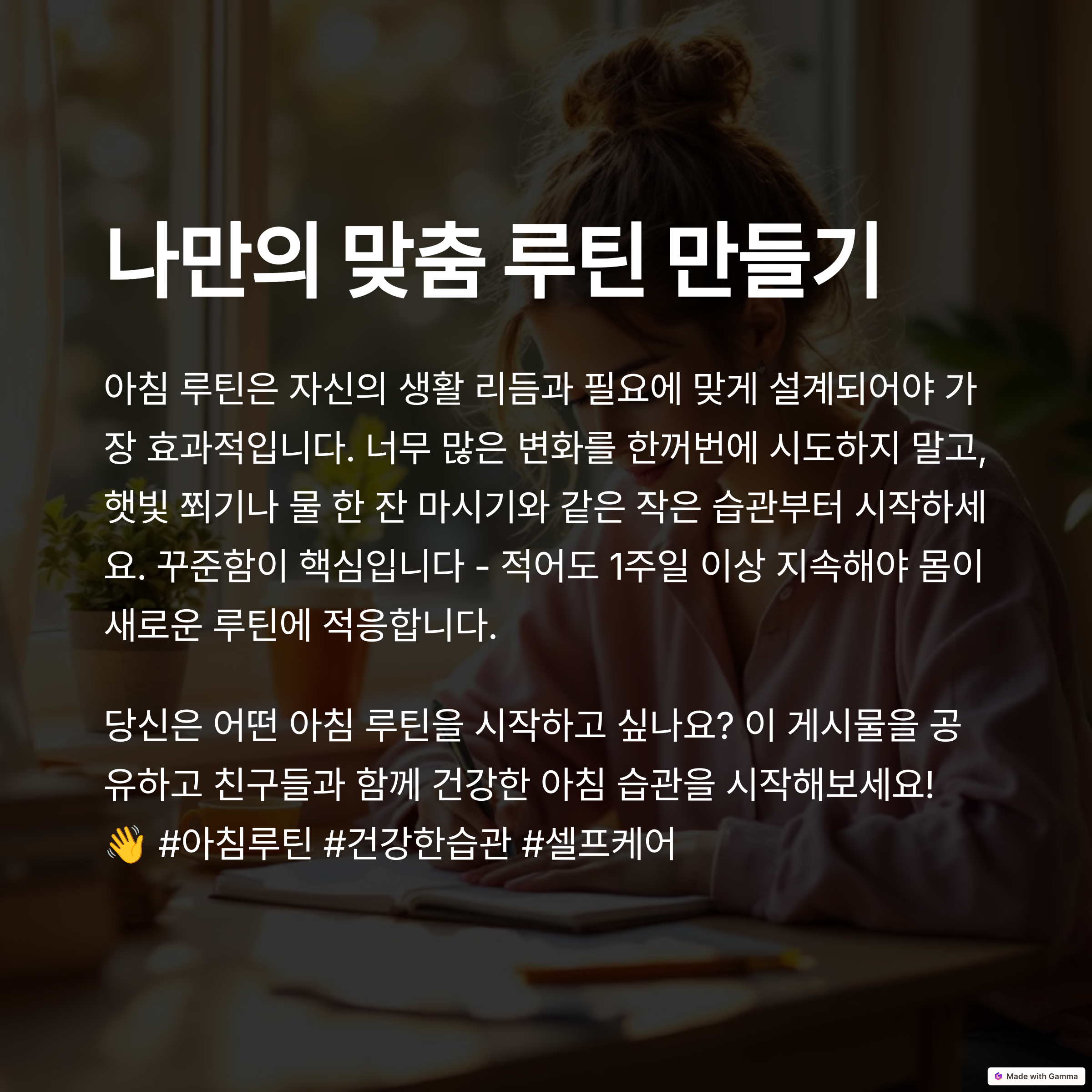 아침 루틴은 단순히 하루의 시작을 의미하는 것이 아니라, 삶의 방향성과 건강한 습관의 근간을 형성하는 중요한 도구입니다.