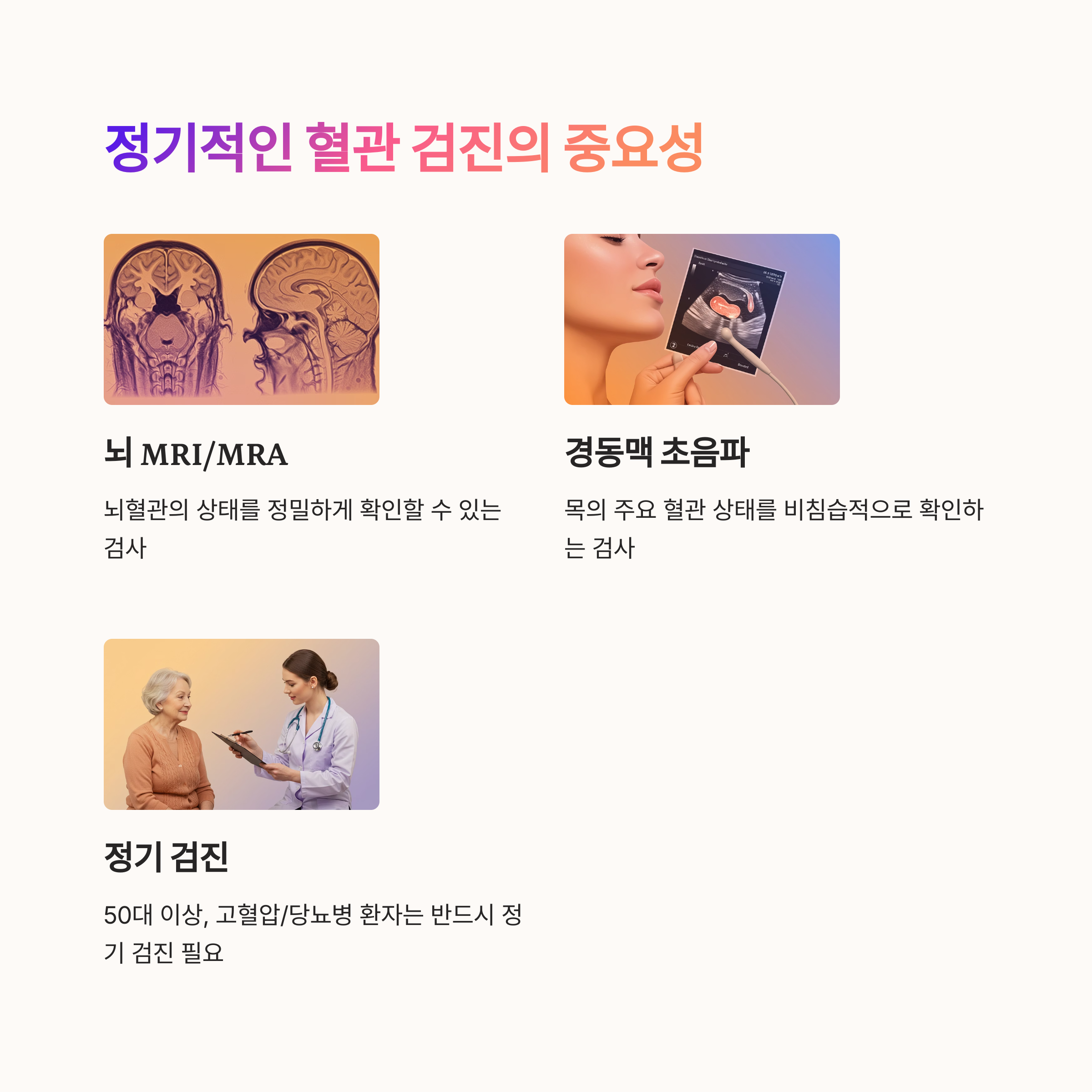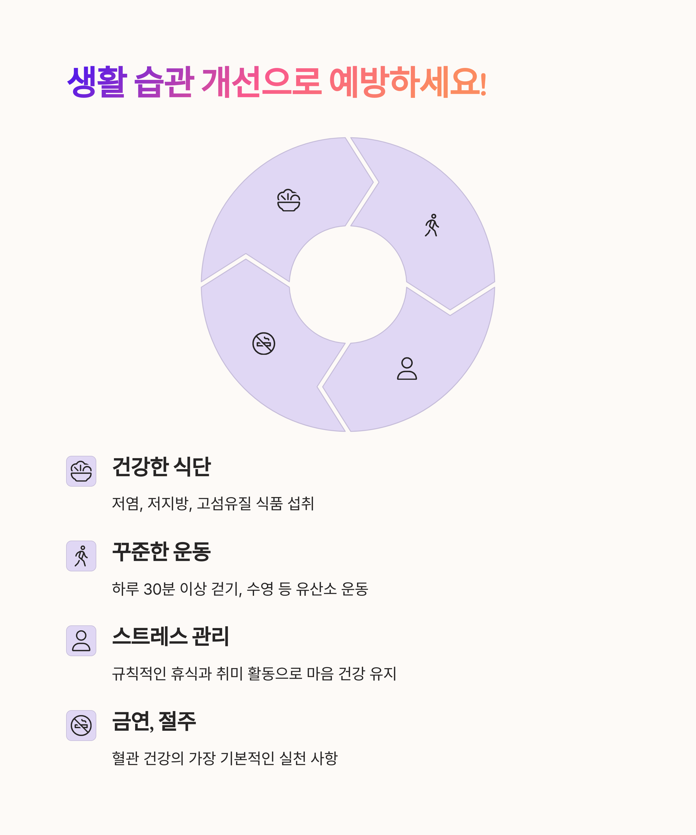 | 협착이 심할 경우 시술이 필요할 수도 있습니다 | 고위험군은 6개월마다 점검 권장 | 스트레스 관리도 혈관 건강에 도움 됩니다 |