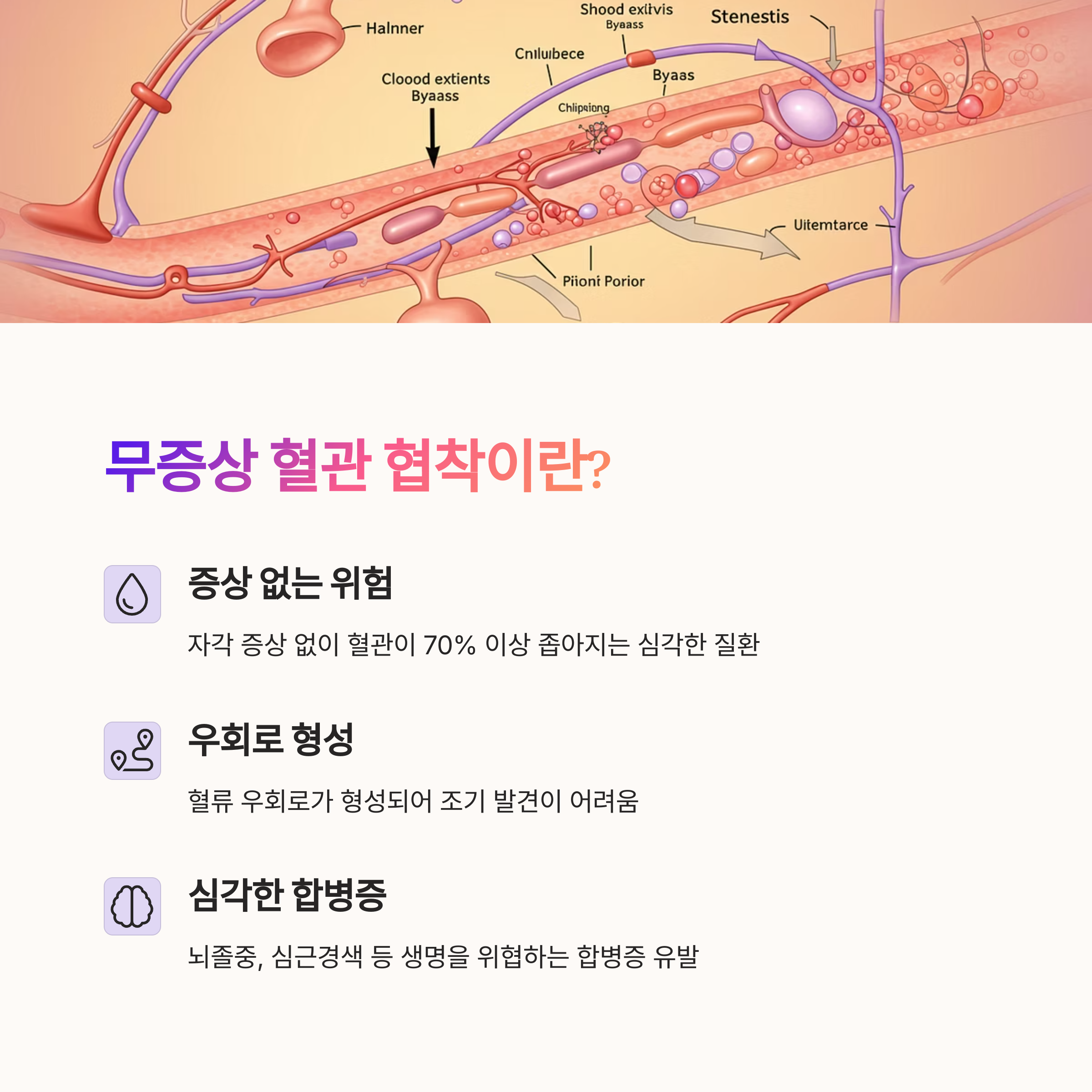 | 무증상 혈관 협착 | 겉으로는 드러나지 않아 조기 발견이 어렵습니다 |