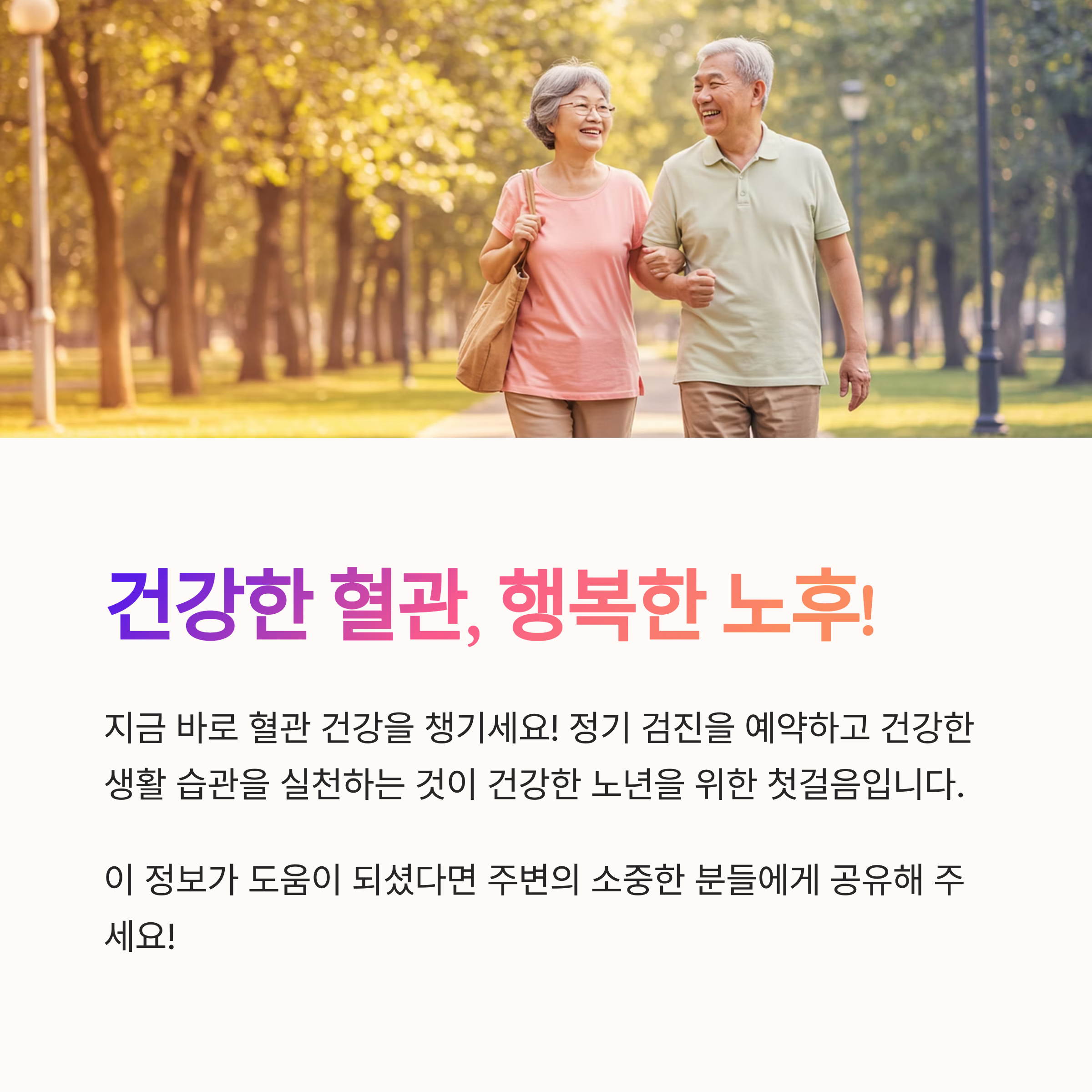 무증상 혈관 협착은 발견이 어렵고 자각 증상이 없기 때문에 노년기 건강을 위협하는 큰 변수입니다. 하지만 우리는 이를 예방하고 관리할 수 있습니다. 정기적인 검진과 더불어, 평소 식습관, 운동 습관을 꾸준히 실천하는 것이 가장 효과적인 방법입니다. 또한 가족력이나 기저 질환이 있다면 더욱 철저하게 체크해야 합니다. 건강한 삶을 위해서는 ‘문제가 생기기 전’부터 준비하고 관리하는 것이 중요합니다. 지금 이 글을 읽고 있는 여러분이 바로 그 첫걸음을 시작하시길 응원합니다.