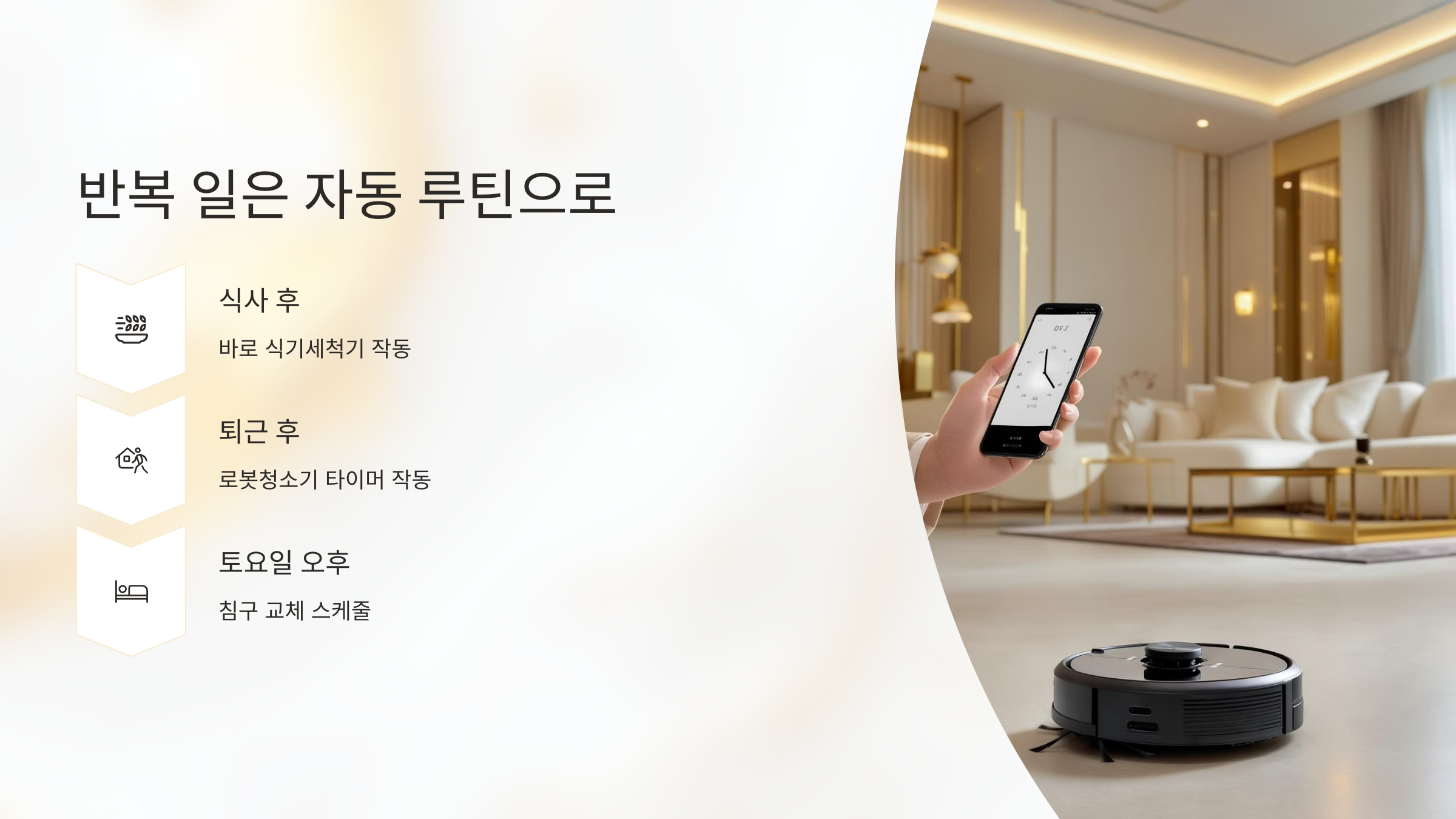 | 토요일 | 창문 및 먼지 제거 | 물걸레 로봇, 정리 타이머 활용 |