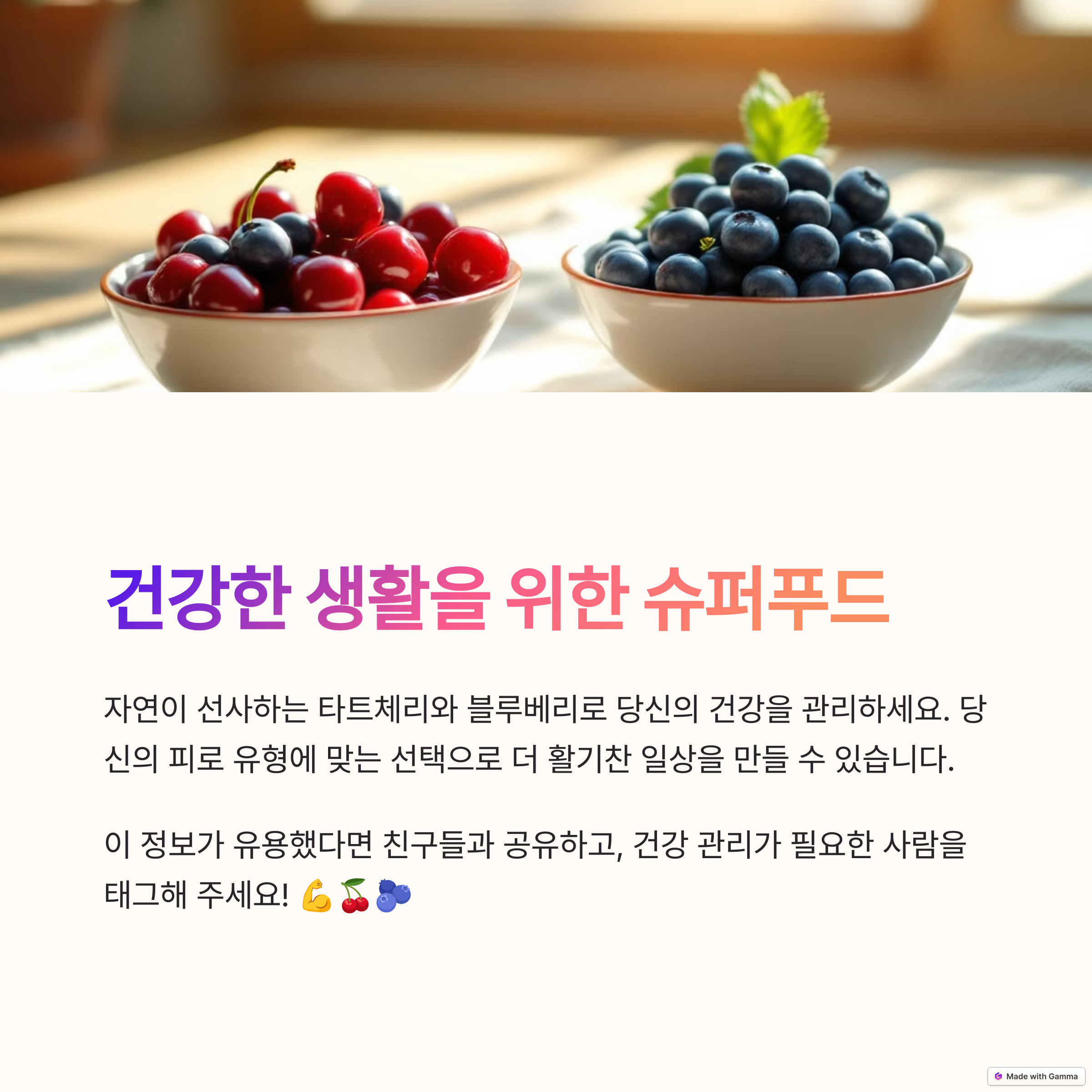 바쁜 일상 속에서 피로는 누구에게나 찾아오는 공통된 고민입니다. 특히 현대인들은 지속적인 업무 스트레스와 수면 부족 등으로 인해 만성 피로에 시달리곤 하죠. 이럴 때 많은 분들이 건강한 음식으로 피로를 회복하려고 합니다. 그중에서도 타트체리와 블루베리는 항산화 성분이 풍부하고, 피로 회복에 효과적이라고 알려져 있어 꾸준히 사랑받는 과일입니다. 하지만, 과연 이 두 과일 중 어떤 것이 더 효과적으로 피로를 개선해줄 수 있을지 궁금하지 않으신가요? 오늘은 이 두 과일의 특성과 효능을 꼼꼼하게 비교해보며, 여러분의 피로를 덜어줄 과일 선택에 도움을 드리고자 합니다. 아래 내용을 천천히 읽어보시고, 지금의 몸 상태에 맞는 과일을 선택해보세요.