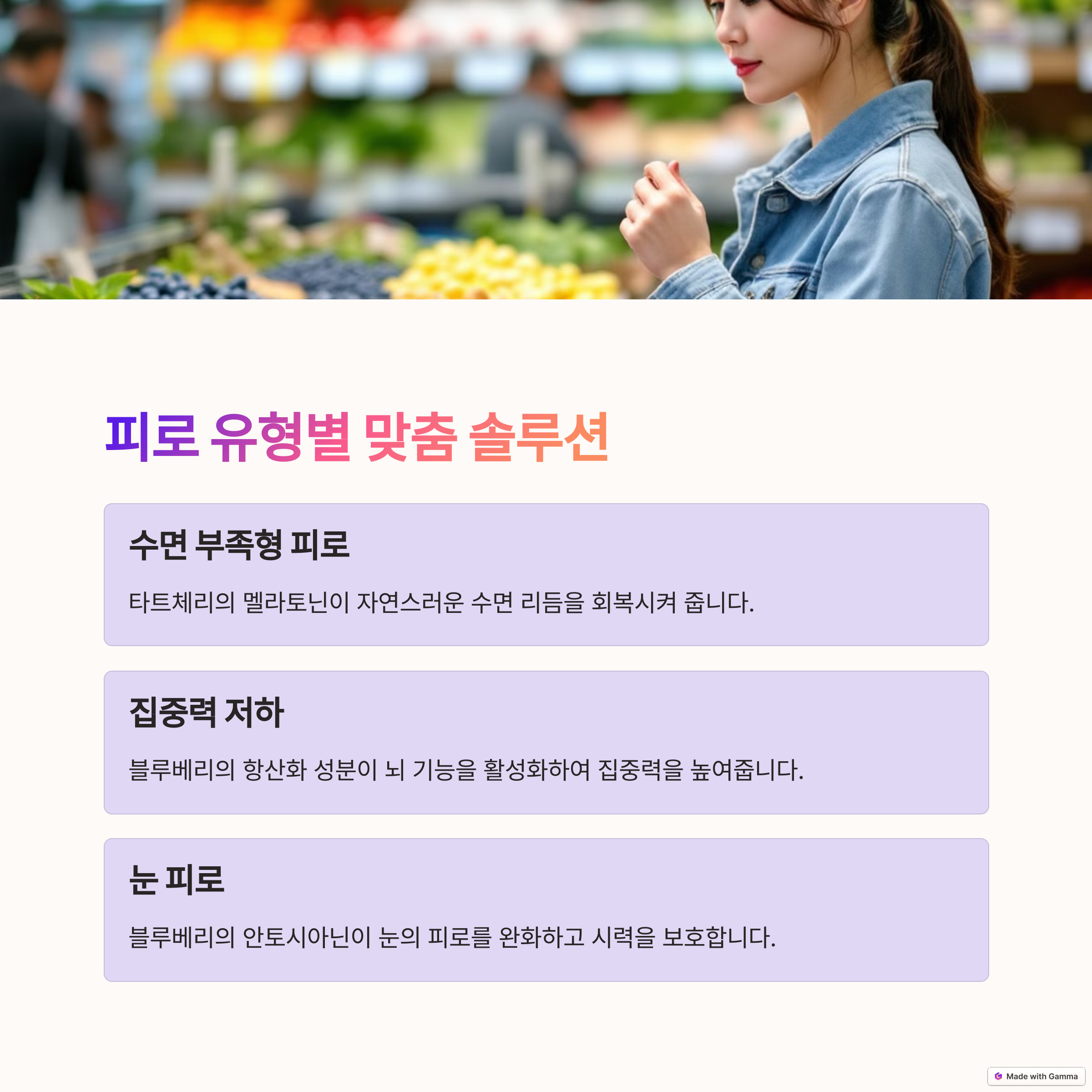 결론적으로 피로회복이라는 키워드만 놓고 본다면 타트체리가 수면의 질 개선에 더 직접적인 영향을 미쳐 피로 해소에 효과적인 선택이 될 수 있습니다. 하지만 블루베리 역시 신경계 건강과 항산화 기능 면에서 탁월하므로 두 과일을 상황에 맞춰 적절히 섭취하는 것이 가장 바람직합니다. 특히 수면 부족형 피로라면 타트체리를, 눈과 뇌 피로가 심하다면 블루베리를 권장합니다.