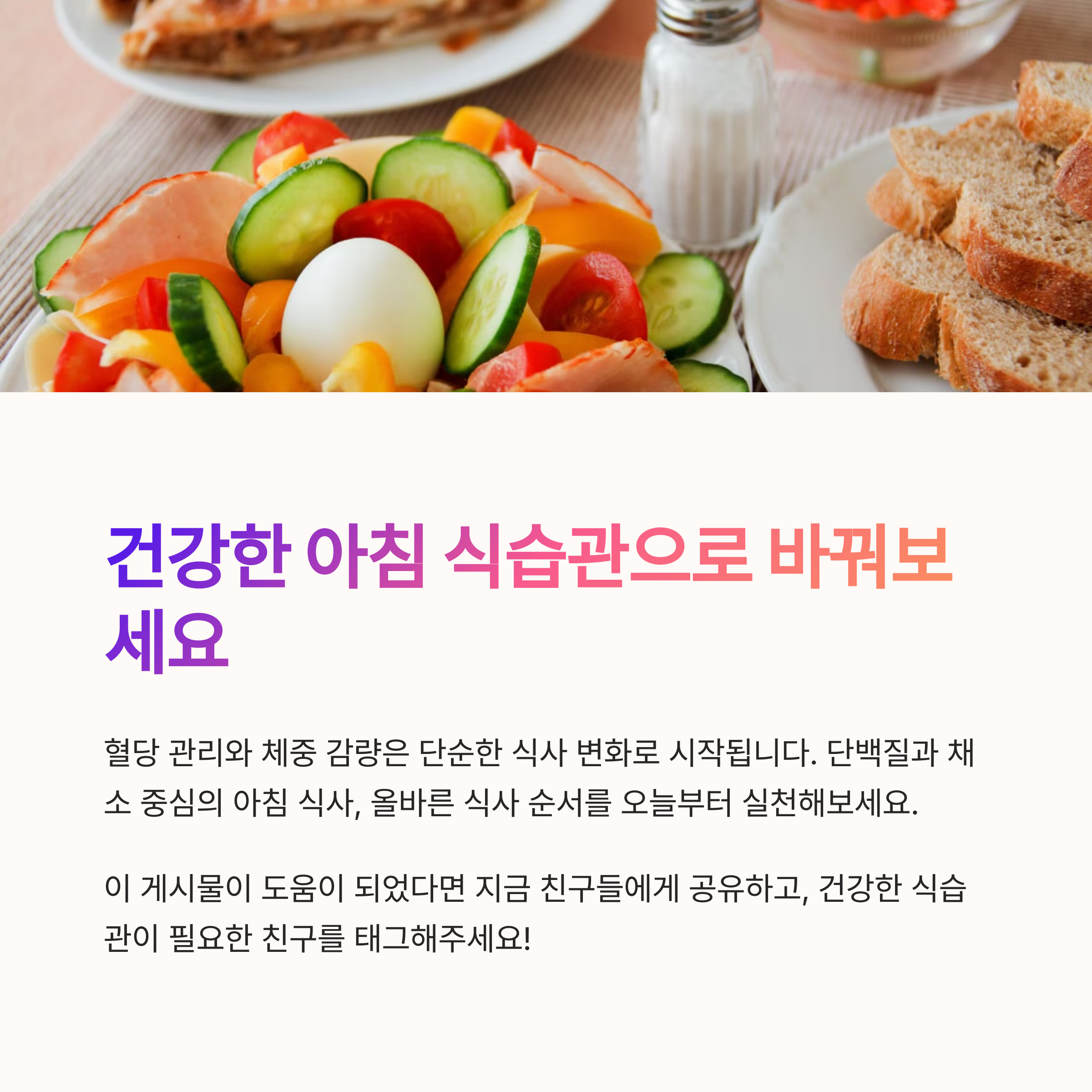 오늘 소개한 아침 식단과 생활 습관에 대해 어떻게 생각하시나요? 여러분만의 아침 루틴이나 식단 팁이 있다면 댓글로 공유해 주세요. 함께 실천하며 더 나은 건강을 만들어가요!