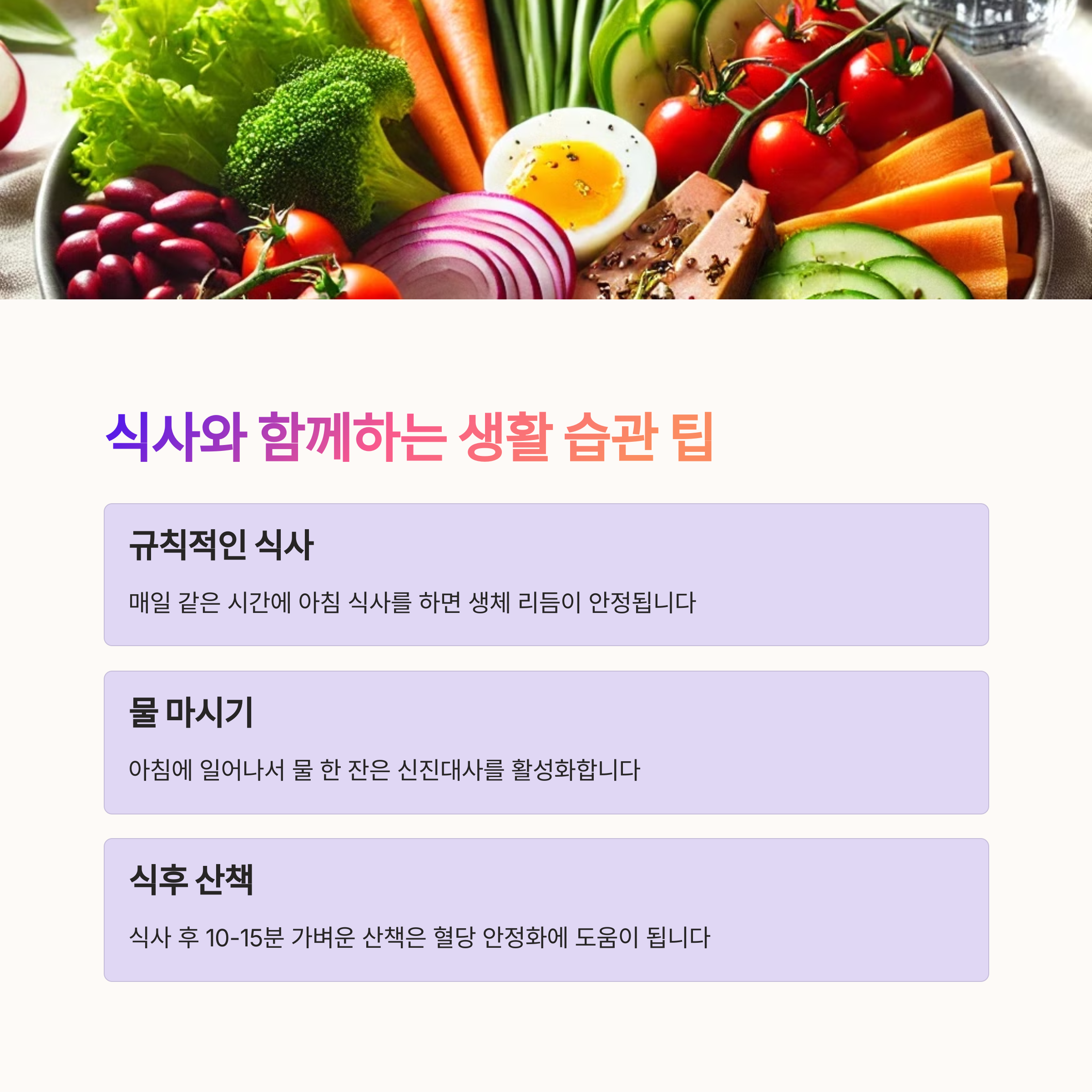 | 혈당 급상승 유발 식품 (빵, 떡, 과자) | 계란, 낫또, 그릭 요거트 등 고단백 식품 | 채소 → 단백질 → 탄수화물 순서로 섭취 |
