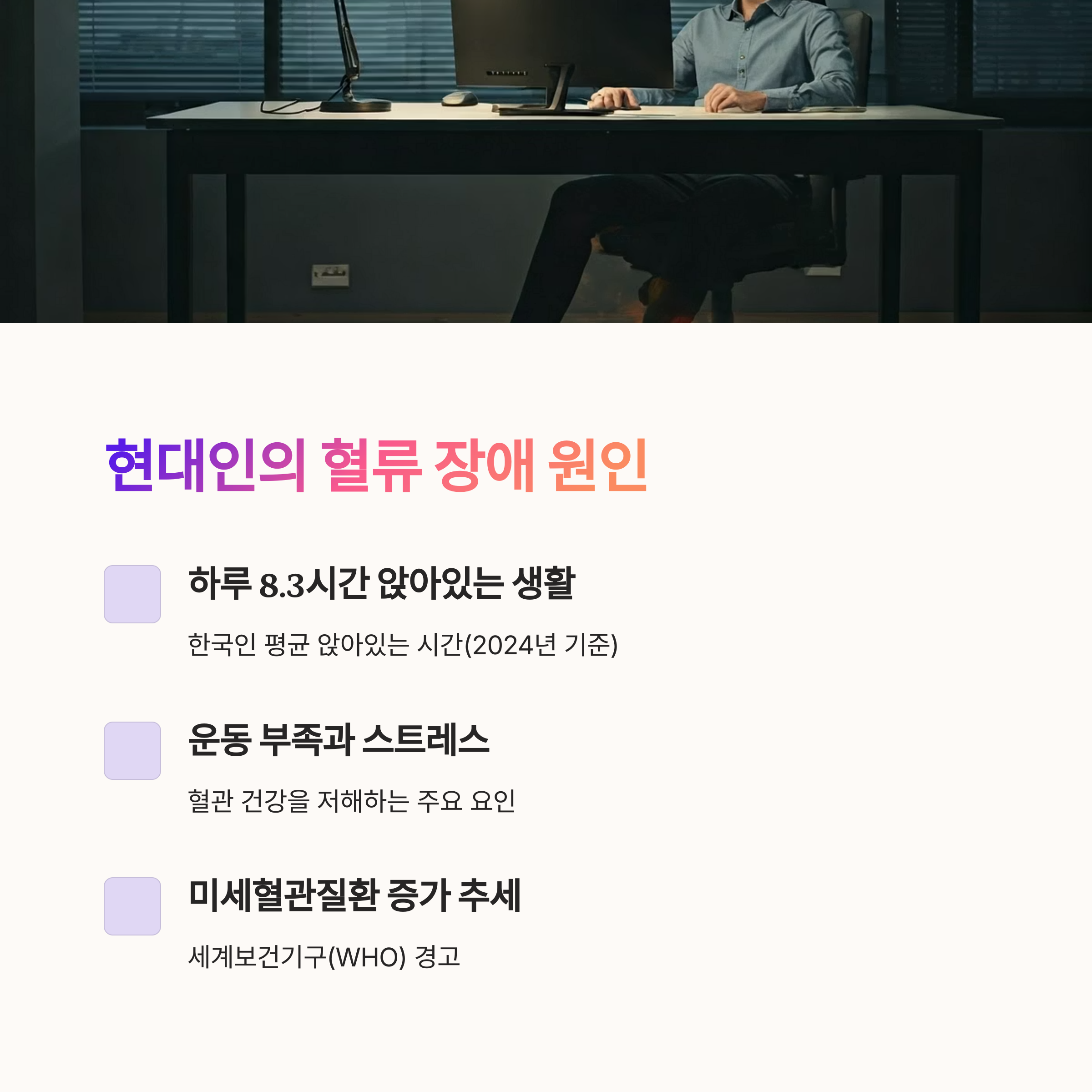 많은 현대인들이 혈류 장애를 겪는 가장 큰 이유 중 하나는 장시간 앉아서 생활하는 습관입니다. 책상 앞에 오래 앉아 있거나 스마트폰을 자주 사용하는 경우, 다리나 팔로의 혈류가 정체되기 쉽습니다. 게다가 운동 부족과 수분 섭취 부족까지 겹친다면 혈액의 점도는 더욱 높아지고, 이는 결국 혈관 질환으로 이어질 위험도 커지게 됩니다. 따라서 평소 스트레칭, 충분한 수분 섭취, 적절한 활동을 통해 혈액순환을 돕는 생활 습관을 유지하는 것이 무엇보다 중요합니다.