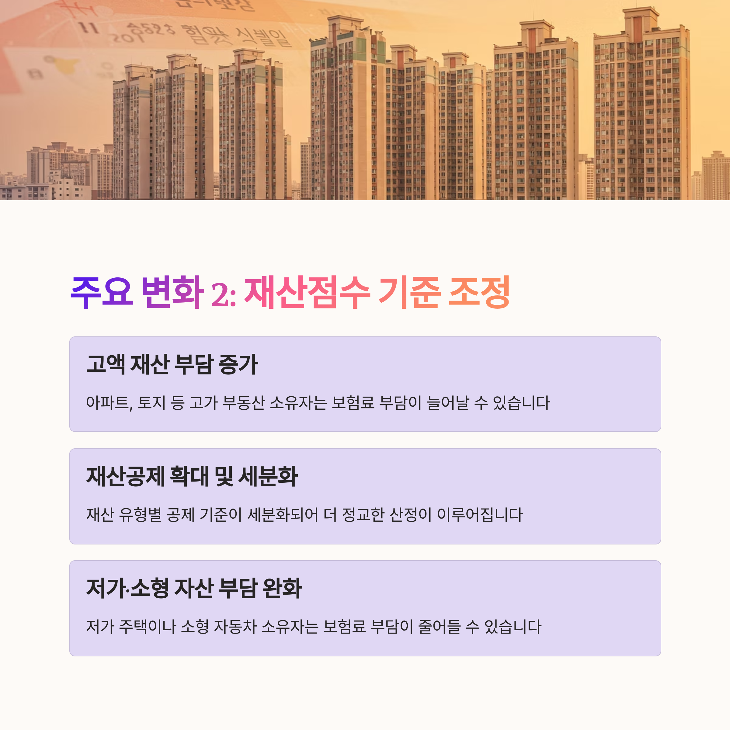 | 실제 소득 중심 반영으로 형평성 강화 | 고액 재산가 대상 점수 차등화 | 저소득층과 은퇴자 중심으로 감경 적용 |