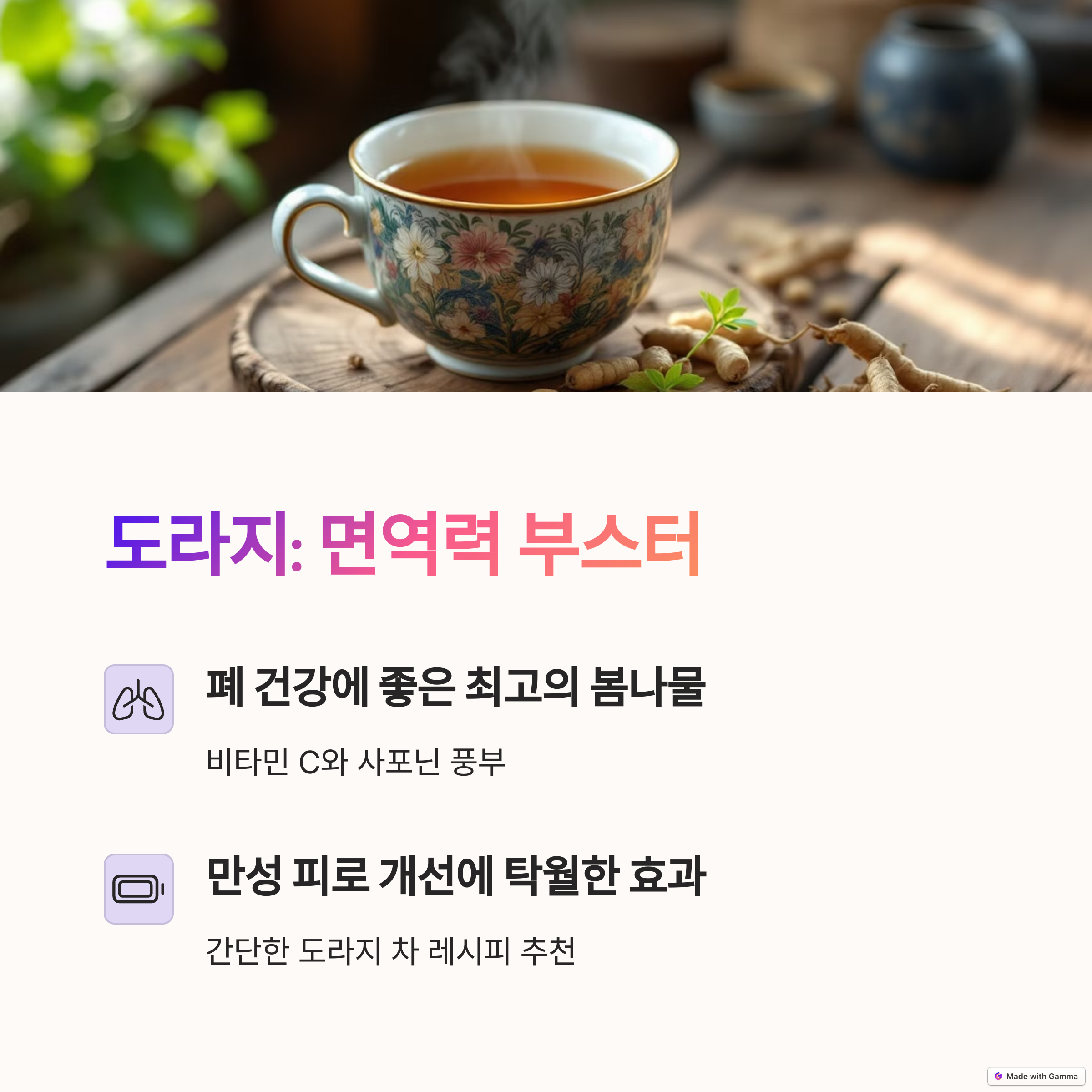 도라지는 기관지 건강에 좋고, 사포닌 성분이 피로 해소에 탁월하죠.