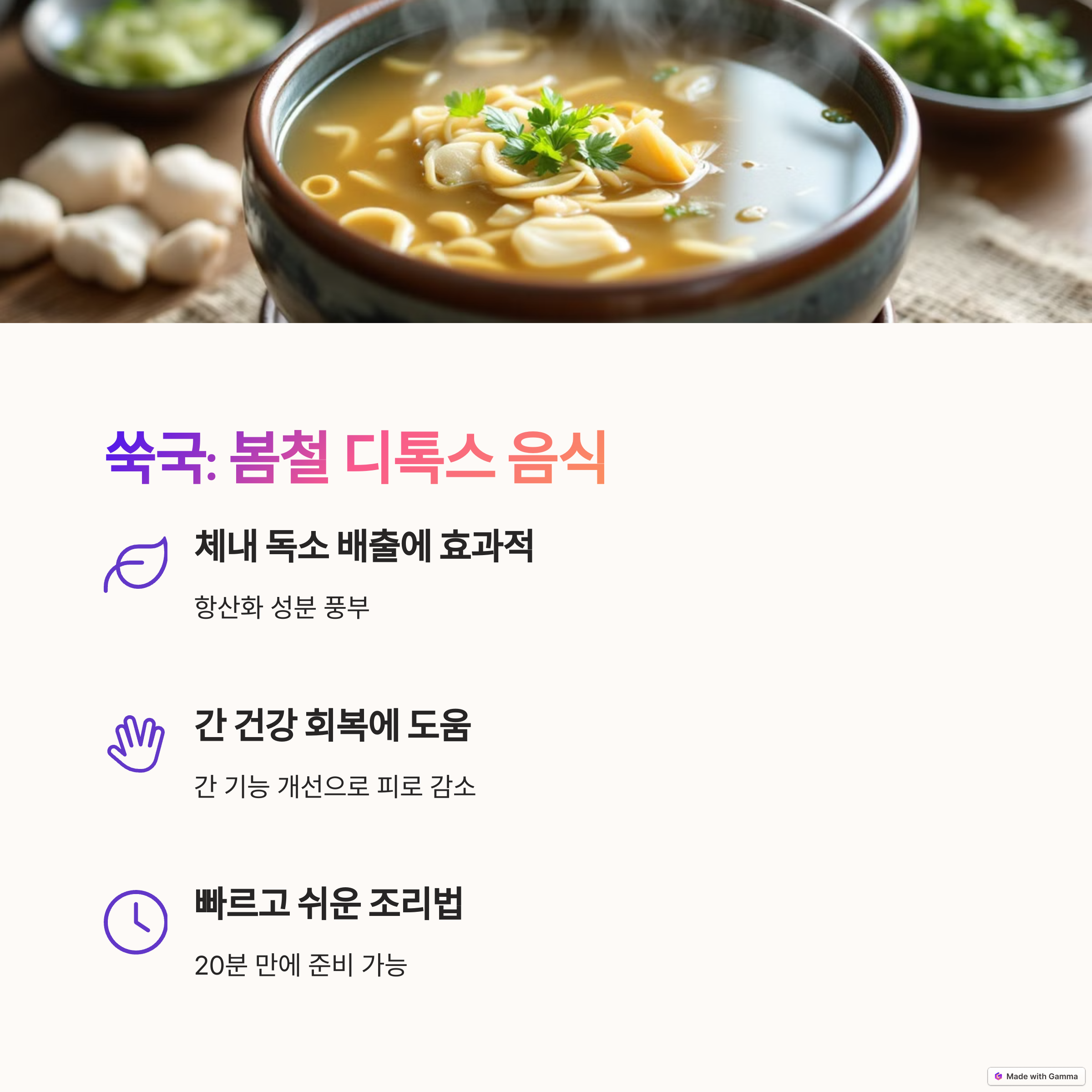 봄에만 먹을 수 있는 별미인데, 비타민 C와 칼슘이 풍부해서 기력 회복에 딱이에요.
